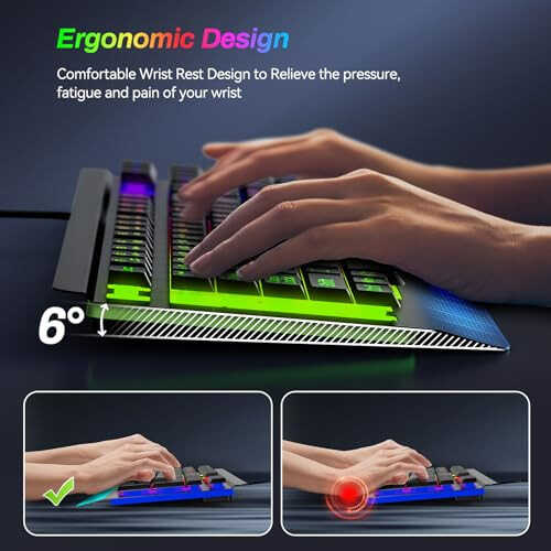 【Graceful 7-Color Rainbow Backlit,Light Up Desktop】This light up keyboard has 2 illumination modes and 3 brightness and 3 speed levels to choose from. Press ☼ Key: Turn backlight on/off; FN+☼: Static/Dynamic backlight. Fn+PgUp: Increase brightness; Fn+PgDn: Decrease brightness. FN+ /-: Adjust the speed of dynamic backlight. (𝐍𝐨𝐭𝐞: 𝐎𝐧𝐥𝐲 𝐫𝐚𝐢𝐧𝐛𝐨𝐰 𝐛𝐚𝐜𝐤𝐥𝐢𝐠𝐡𝐭 𝐚𝐯𝐚𝐢𝐥𝐚𝐛𝐥𝐞, 𝐜𝐚𝐧𝐧𝐨𝐭 𝐛𝐞 𝐚𝐝𝐣𝐮𝐬𝐭𝐞𝐝 𝐭𝐨 𝐬𝐢𝐧𝐠𝐥𝐞-𝐜𝐨𝐥𝐨𝐫 𝐥𝐢𝐠𝐡𝐭). 【Large Print Keyboard, More Easy Read and Type】This large print keyboard has fonts 4 times larger than standard keyboards, making it simple, straightforward and easy to locate, offers excellent comfort and can relieve eye fatigue caused by small fonts while typing. Great for beginners who want to improve their typing speed, also great for seniors, students and office workers. 【Premium Metal Panel Keyboard,Textured and Quality】This rainbow backlit keyboard features a matte metal panel, enhancing both the overall tactile sensation of the keyboard and its durability and water resistance. Additionally, If you accidentally spill the water from the teacup on the keyboard, just wipe it gently with a paper towel. The anti-splash structure makes the keyboard more strong. 【12 Multimedia Keys & 19 Anti-Ghosting Keys,More Efficiency and Precise】This computer keyboard features 12 dedicated multimedia keys for quick access to functions like calculator, music media, volume control, email, and more. This 19 anti-ghosting keys ensure that every keystroke is registered without any loss, ensuring smooth typing. You can swap the WSAD keys with the arrow keys by pressing FN+W and lock/unlock the WIN key by pressing FN+WIN. (𝐍𝐨𝐭𝐞: 𝐌𝐮𝐥𝐭𝐢𝐦𝐞𝐝𝐢𝐚 function𝐬 may 𝐧𝐨𝐭 be 𝐚𝐯𝐚𝐢𝐥𝐚𝐛𝐥𝐞 𝐨𝐧 𝐌𝐚𝐜 OS) . 【Ergonomic Design with Wrist Rest,Natural Angle and Comfortable】This computer keyboard features a scientific stepped keycap design, maximizing hand comfort during extended gaming or work sessions. It also provides an ergonomic typing angle (6°) and wrist support. All keys offer a soft touch, without loud clicking noises, allowing for late-night typing or gaming without disturbing others. 【Strong Compatibility & Quality Assurance】This wired Gaming keyboard features a classic volcano switch structure, capable of enduring 50 million keystrokes. The UV coating ensures legends that are more fade-resistant. Detachable keycaps allow for quick cleaning, without worrying about dust. It supports plug-and-play functionality and boasts wide compatibility with Windows 7/8/9/10/11/95/98/XP/2000/ME/VISTA, as well as Mac. 【VIP After-Sales Service】If you encounter any issues with the wired Gaming keyboard, including but not limited to keycap fading, key malfunction, non-operation, we provide 24Months VIP supports for any question.