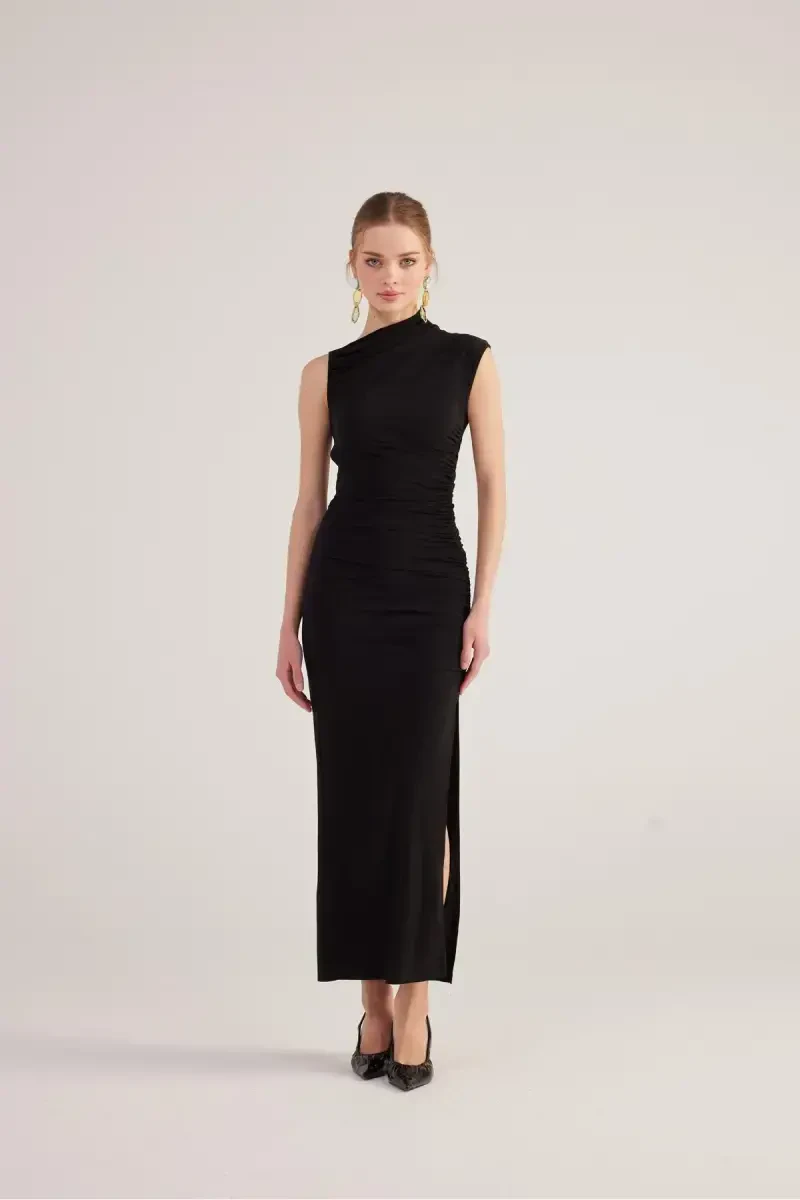 Büzgü detaylı elbise, yırtmaçlı uzun elbise, siyah elbise, asimetrik yaka, kolsuz elbise, Lily elbise, Holly Lolly, özel tasarım elbise, XS beden, Trendyol elbise