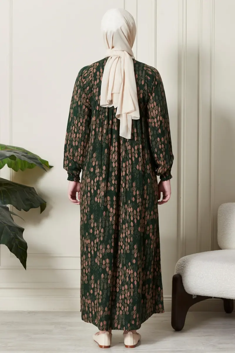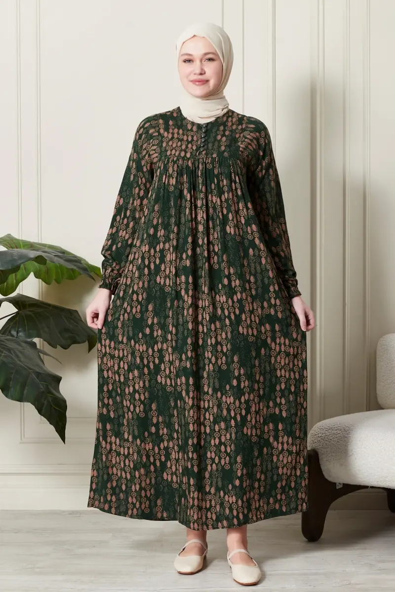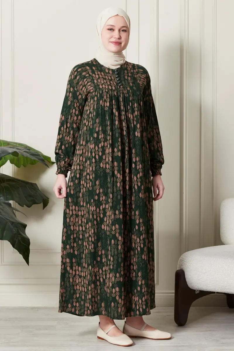 Büzgü Robadan Önü Düğmeli Viskon Kumaş Tessetür Giyim Anne Elbisesi Namaz Elbisesi-Dal Desen Haki