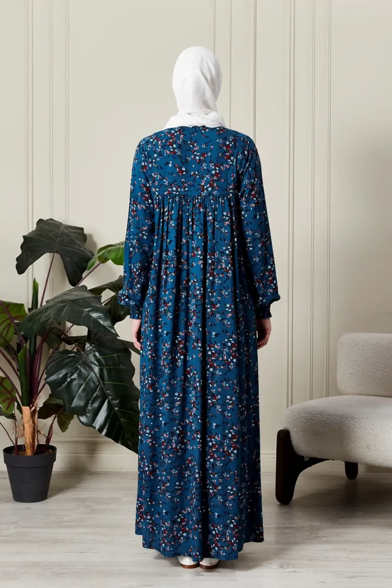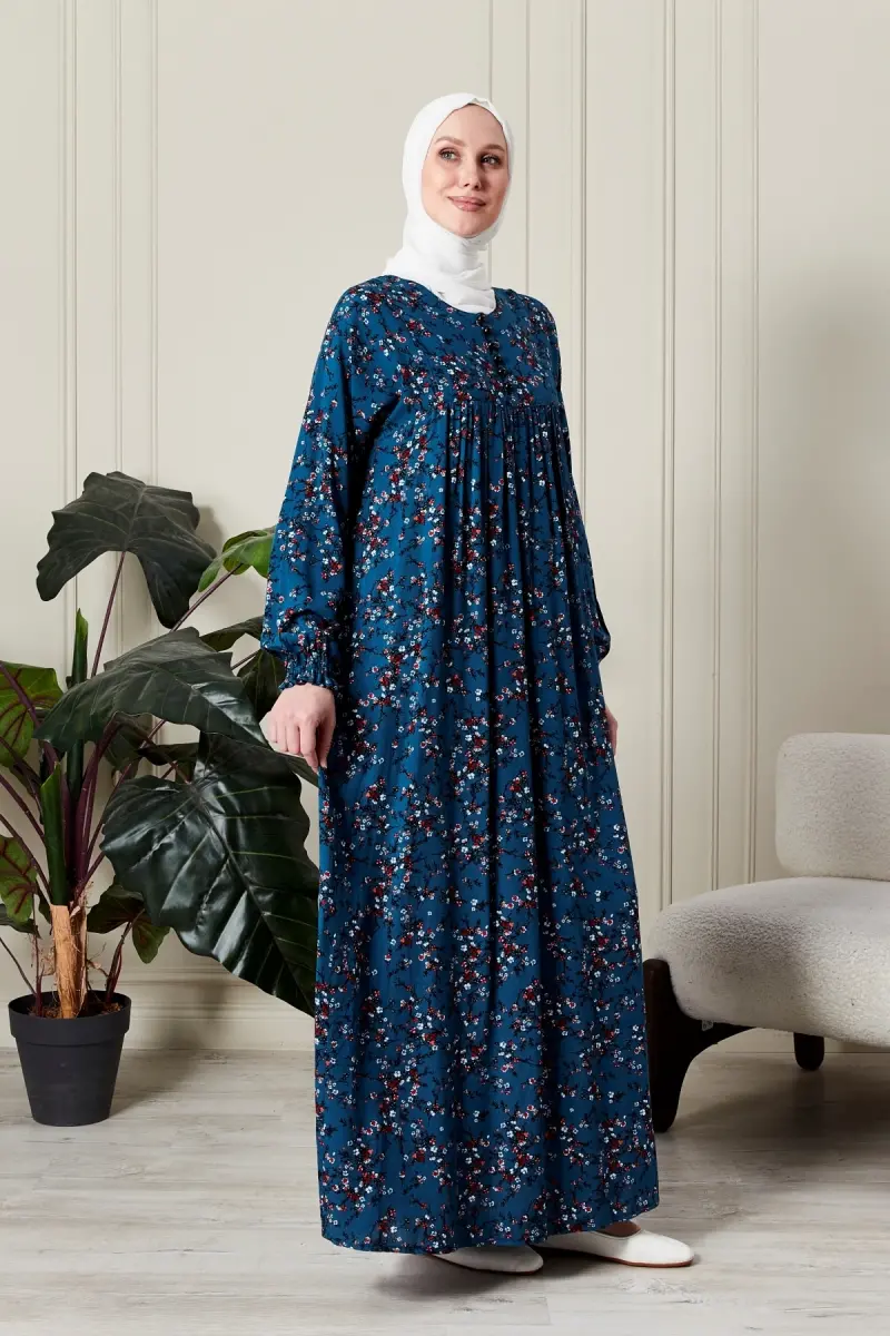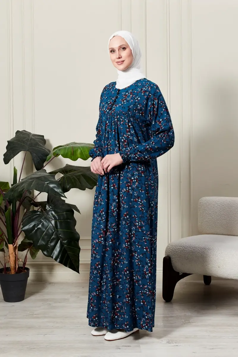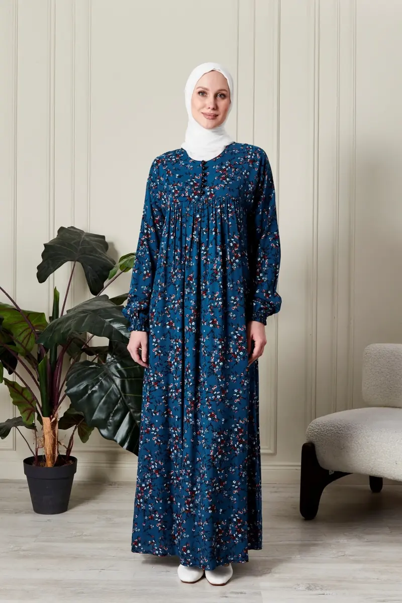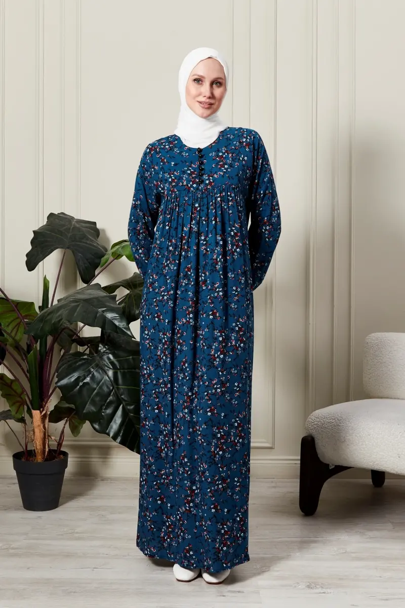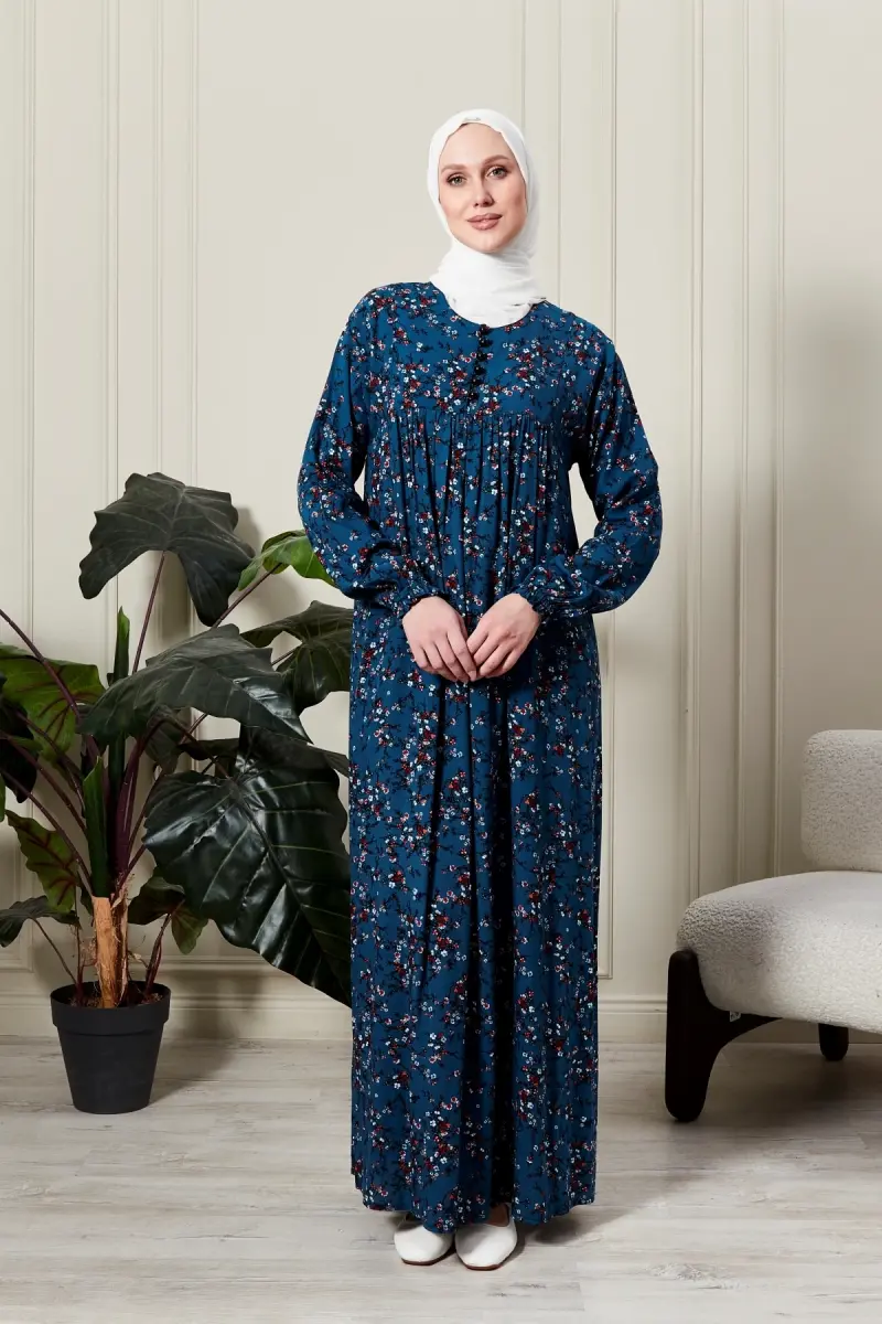 Büzgü Robadan Önü Düğmeli Viskon Kumaş Tessetür Giyim Anne Elbisesi Namaz Elbisesi-dal ve çiçek desenli mavi