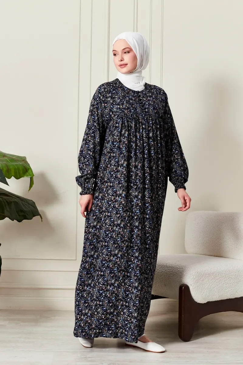 Büzgü Robadan Önü Düğmeli Viskon Kumaş Tessetür Giyim Anne Elbisesi Namaz Elbisesi-Şal Desen Lacivert