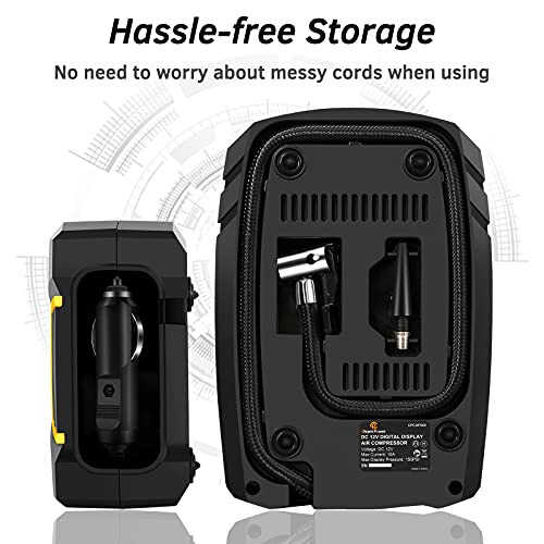 C P CHANTPOWER Havo kompressori shinalarni shishirish moslamasi, 12V DC avtomobil shinalari pompasi raqamli bosim o'lchagich bilan, 150PSI avtomobil quvvat adapteri bilan, avtomobil shinalari, velosipedlar va boshqa shishiriladigan narsalar uchun avtomatik o'chirish (1-sariq)