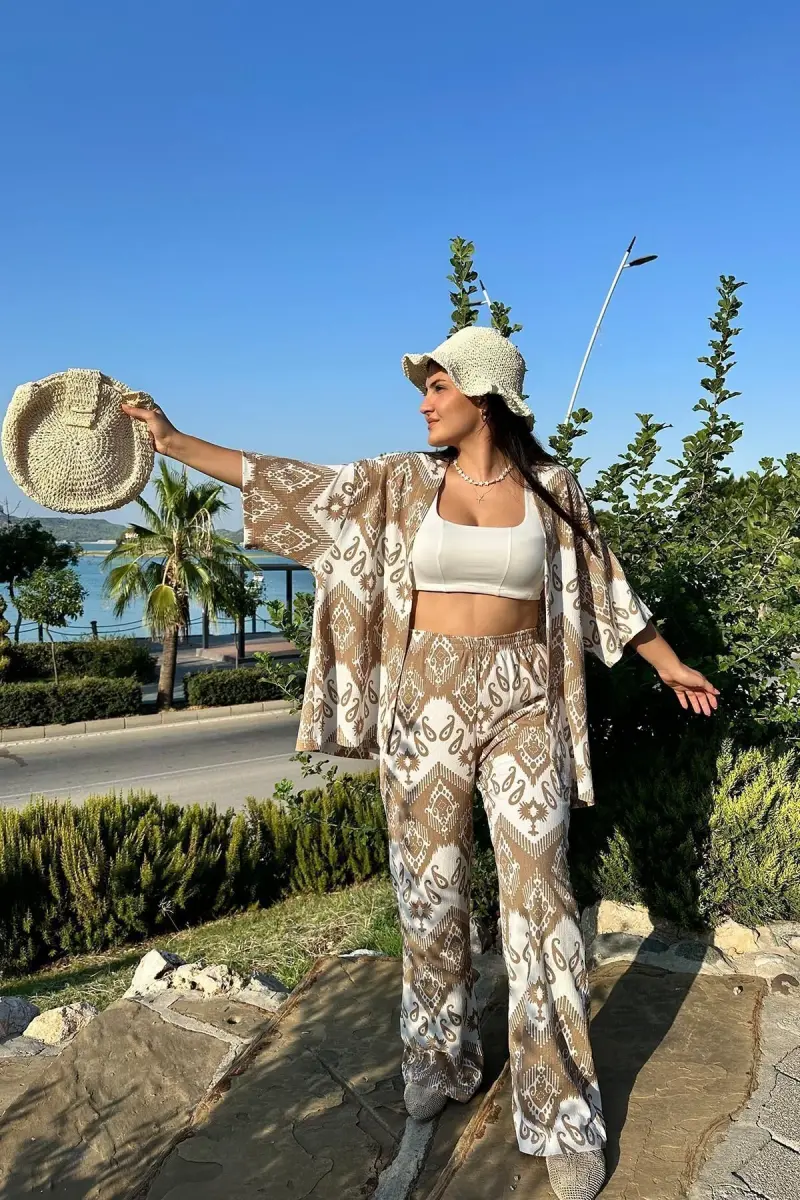 Camel Renk Desenli Ikili Kimono Takım ( Rahat Kalıp )-Camel
