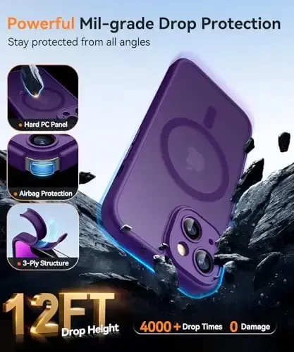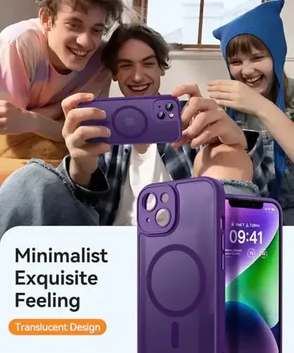 iPhone 14 g‘ilofi, magnitli g‘ilof, Magsafe mos, to‘q binafsha, kamera himoyali, zarbga chidamli, yarim shaffof, mat sirt, ingichka dizayn, Canshın