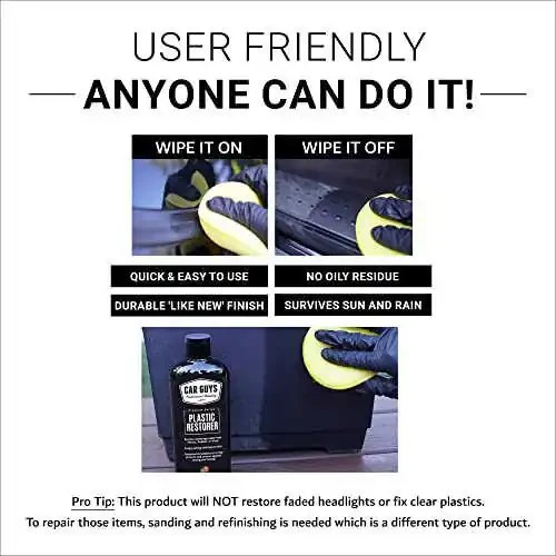 It's incredibly easy to use. Simply apply the product with a sponge or microfiber cloth, then wipe it off and watch your vehicle look like new. CAR GUYS Plastic Restorer is a safe and effective solution to improve the look of your vehicles.