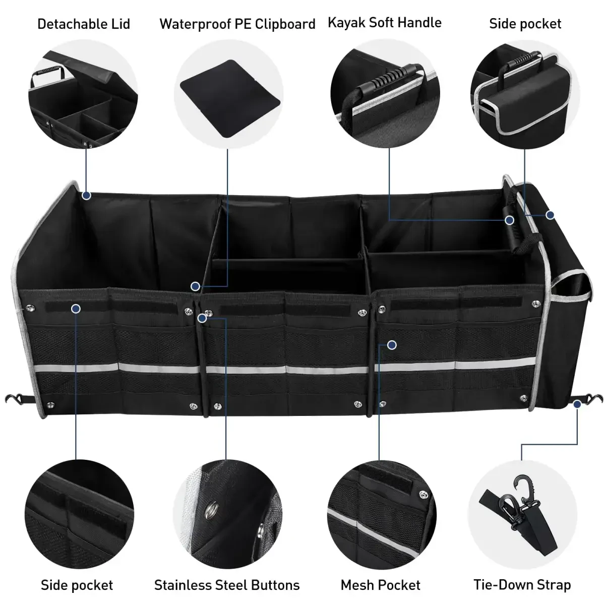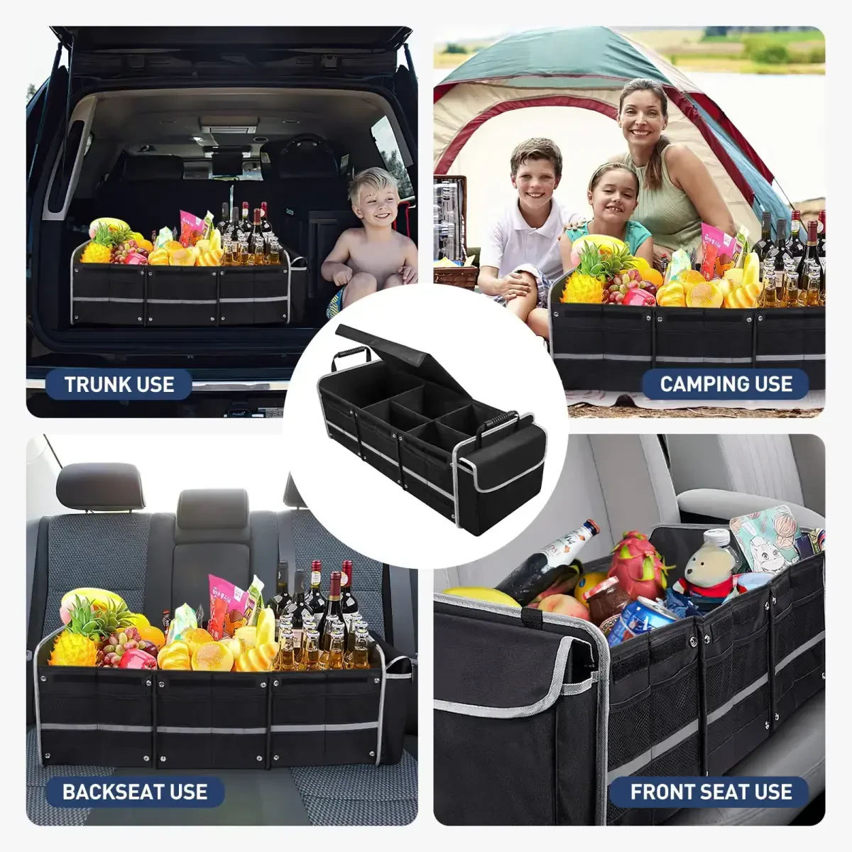 Keeping your car trunk organized is now very easy with the Car Storage Organizer! The Collapsible Multi Compartment SUV Trunk Organizer is not just a trunk organizer, but also a versatile helper. Ideal for all vehicle types, whether SUV, van or passenger car, this product allows you to safely carry and organize your belongings. It is the perfect solution for your tools, grocery shopping, emergency equipment, children's toys, food, sports equipment and more. Moreover, thanks to the premium foldable cooler bag, you can keep your drinks and food cool or warm. It is designed with reflective strips to increase your safety during night trips. Thanks to its durability and waterproof features, you can use it smoothly for many years. 1680D Oxford Polyester material is manufactured to withstand the weight of heavy items. Dividers made of PE sheet are waterproof and more robust, so they are less likely to bend or collapse when weight is added. Thanks to its multi-compartment design, you can separate your belongings as you wish. It comes with sturdy walls, 3 base plates and 2 removable dividers. Thanks to its foldable feature, you can separate it up to 3 compartments according to your needs and use it in your trunk, front seat or back seat. Removable dividers help you organize items of different sizes, while 6 mesh pockets are designed to store your small items. There is also a side pocket for quick access. It is extremely easy to use, install and clean. It can be easily installed and folded. You can completely fold it up when you are not using it to save space. Don't forget to take it with you when you go shopping or to the supermarket. It is both useful and environmentally friendly. When you want to clean it, simply wipe the surface with a damp cloth. The Car Storage Organizer is an indispensable product for anyone who loves organization in their car.