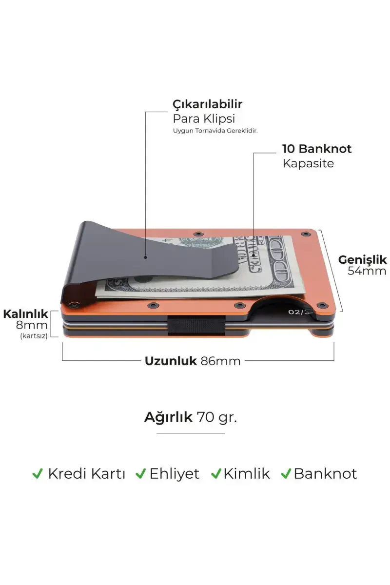 Cardx - Burano Clips New Generation Minimalist Wallet & Metal Cardholder is a unisex accessory that meets the needs of modern life and combines elegance and functionality. Designed by Louise Motto, this wallet offers a much more elegant and contemporary look compared to traditional leather wallets. Its orange color reflects an energetic style, while its minimalist design allows it to easily match any outfit and complete your combination. Made of aluminum material, this cardholder stands out with its durability and lightness. It offers practicality in daily use and also attracts attention as a stylish accessory. Thanks to its ergonomic structure, you can easily access your cards and store them in an organized manner. The elastics on the three edges of the metal wallet ensure that the cards are held securely and prevent them from slipping. The paper money clip on the back helps you keep your cash organized and also allows you to attach the cardholder to your belt or pocket. Louise Motto New Generation Wallet & Cardholder is not just a wallet, but also an accessory that complements your style. Thanks to its RFID protection feature, it keeps your cards safe at the highest level. It prevents your cards from being debited without permission from POS devices while in the wallet. In this way, you can be sure that your personal and financial information is safe. Its compact credit card-sized design allows you to carry it easily in your pocket or bag. Whether for daily use or special occasions, Cardx - Burano Clips New Generation Minimalist Wallet & Metal Cardholder is a stylish and secure solution that you can always carry with you. This product, sent in a Louise Motto gift box, also offers an unforgettable gift option for your loved ones. It is one of the best ways to show your loved ones that you care on special occasions such as Mother's Day, Father's Day, Valentine's Day, New Year's Eve, Birthday, Graduation, Anniversary or Teacher's Day. This new generation wallet, suitable for the modern age, will add value to both you and your loved ones.