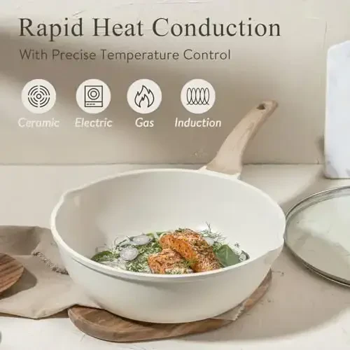 Секрет создания кулинарных шедевров и превращения приготовления пищи в приятный опыт заключается в наличии правильного оборудования. Набор из 16 предметов антипригарной посуды CAROTE разработан для того, чтобы сделать время, проведенное на кухне, более продуктивным, здоровым и приятным. Этот набор не только добавит элегантности вашей кухне благодаря своему белому гранитному виду, но и облегчит приготовление пищи благодаря превосходным антипригарным свойствам. Этот набор, совместимый со всеми типами плит, включая индукционные, объединяет широкий ассортимент кастрюль и сковородок для удовлетворения любых ваших потребностей. Усиленная конструкция из литого алюминия обеспечивает долговечность и надежность, а легкий дизайн обеспечивает простоту использования. С CAROTE сделайте шаг в новую эру на кухне и наслаждайтесь приготовлением пищи. Сковороды и кастрюли разных размеров, входящие в комплект, идеально подходят для приготовления любых блюд. Будь то быстрый завтрак или специальный ужин для ваших гостей, набор CAROTE всегда будет рядом с вами. Благодаря антипригарной поверхности ваши блюда легко готовятся, а проблема очистки исчезает. Набор CAROTE, изготовленный из здоровых материалов, не содержащих PFOS и PFOA, является безопасным выбором для вашей семьи. CAROTE делает время, проведенное на кухне, ценным и помогает превратить приготовление пищи в искусство. С этим набором бросьте вызов своим пределам на кухне и попробуйте новые рецепты. Набор из 16 предметов антипригарной посуды CAROTE поднимет ваш кулинарный опыт на новый уровень.