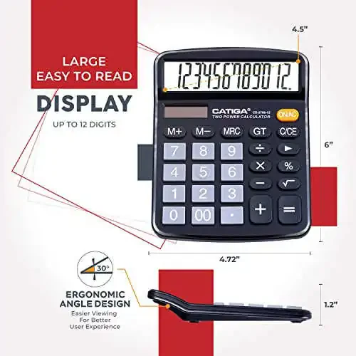 The CATIGA 12 Digits Desktop Calculator makes your calculations quick and easy. With its large LCD screen, you can easily read the numbers from a distance. Its responsive buttons make the keying process faster and smoother. The large key size prevents you from hitting the wrong button. The CATIGA Desktop Calculator is powered by both solar and battery power (battery included). The solar panel will power up the calculator as long as you use it in a lit environment. It is designed for various occasions, including business, office, home, basic budgeting, school, and more. Use it to assist your personal finance or just for a quick calculation session. The CATIGA 12 Digits Desktop Calculator is equipped with functions such as addition, subtraction, multiplication, division, backspace, grand total, CE, %, M+/M-/MRC, On/AC Button, and Auto Power-Off. The calculator will turn itself off after about 6 minutes of being idle.
