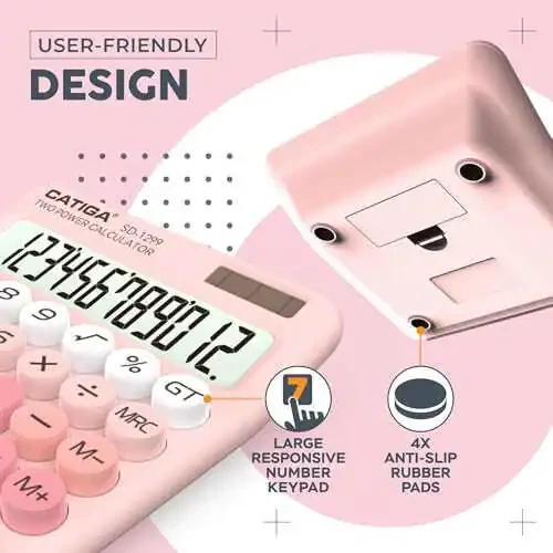 CATIGA Mechanical Switch Calculator with Solar and Battery Dual Power is a perfect desktop calculator for home, school, and office use, featuring dual power supply with solar and battery, a 12-digit large LCD display, and cute aesthetic design with big buttons.