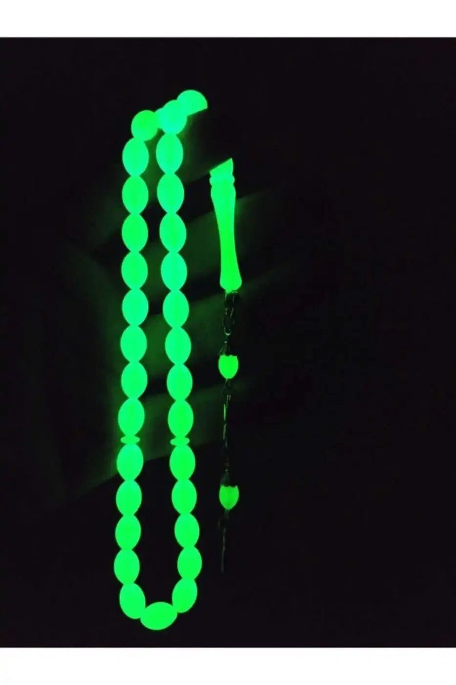 Every bead of this tasbih emits a vibrant green glow in the dark, creating an ethereal radiance at night. Its silver-plated tassel and crescent moon-and-star embellishment add a visually appealing touch. It serves as an excellent choice to accompany you on your spiritual journey or for everyday use.