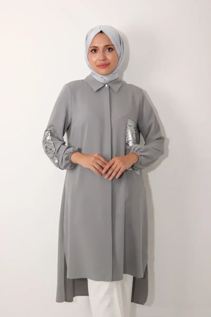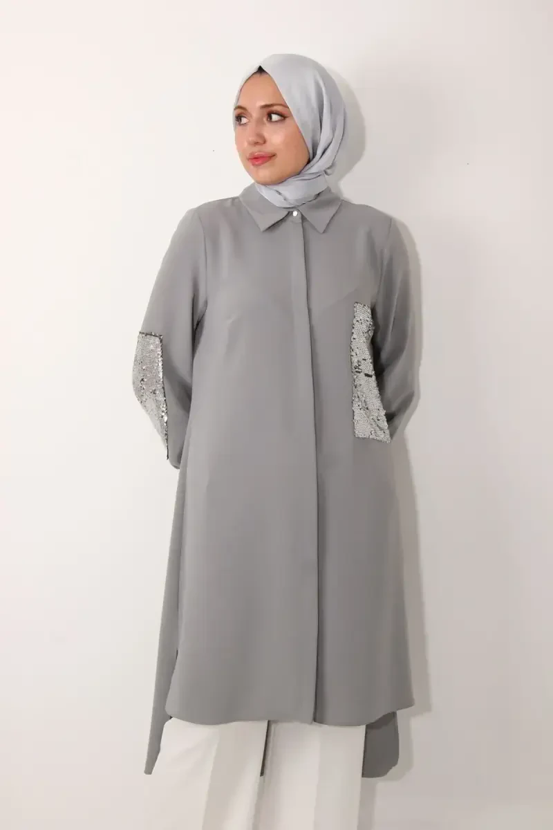 Cebi Ve Kolu Payetli Uzun Tunik-Gri, modern ve şık görünümü bir araya getiren, gardırobunuzun vazgeçilmez parçalarından biri olmaya aday. Bu özel tasarım tunik, hem günlük kullanımda hem de özel etkinliklerde rahatlıkla tercih edebileceğiniz çok yönlü bir seçenektir. Tuniğin en dikkat çekici özelliği, ceplerinde ve kollarında bulunan zarif payet detaylarıdır. Bu payetler, tuniğe sofistike bir ışıltı katarken, kombininize anında hareket ve canlılık kazandırır. Uzun kesimi, vücut hatlarını nazikçe örterek hem rahat bir kullanım sunar hem de şık bir siluet oluşturmanıza yardımcı olur. Gri rengi, farklı renklerle kolayca kombinlenebilir olması sayesinde, stilinizi özgürce ifade etmenize olanak tanır. İster jeanlerle günlük bir tarz yaratın, ister şık bir pantolonla daha özel bir görünüm elde edin, bu tunik her durumda size eşlik edecektir. Yüksek kaliteli kumaşı sayesinde gün boyu konforlu bir kullanım deneyimi sunarken, uzun ömürlü yapısıyla da gardırobunuzda uzun yıllar yerini koruyacaktır. Cebi Ve Kolu Payetli Uzun Tunik-Gri, hem modern hem de klasik tarzı benimseyen kadınlar için ideal bir seçimdir. Şıklığı ve rahatlığı bir arada arayanlar için mükemmel bir alternatiftir. Bu tunik ile her ortamda dikkatleri üzerinize çekebilir, stilinizi en iyi şekilde yansıtabilirsiniz. Gardırobunuzu zenginleştirmek ve şıklığınıza şıklık katmak için bu özel tasarım tuniği kaçırmayın. Günlük hayatınızda veya özel anlarınızda size eşlik edecek, stilinizi tamamlayacak ve özgüveninizi artıracak bir parça olarak Cebi Ve Kolu Payetli Uzun Tunik-Gri'yi tercih edebilirsiniz.