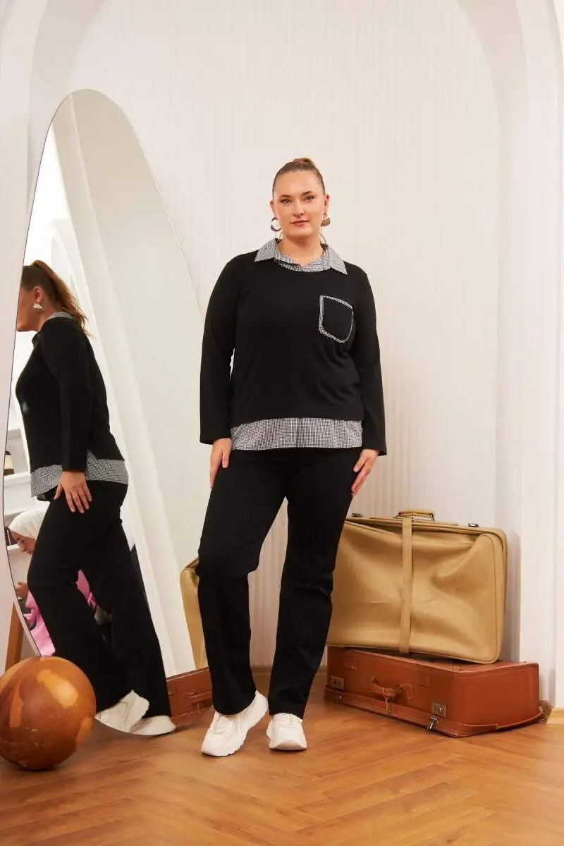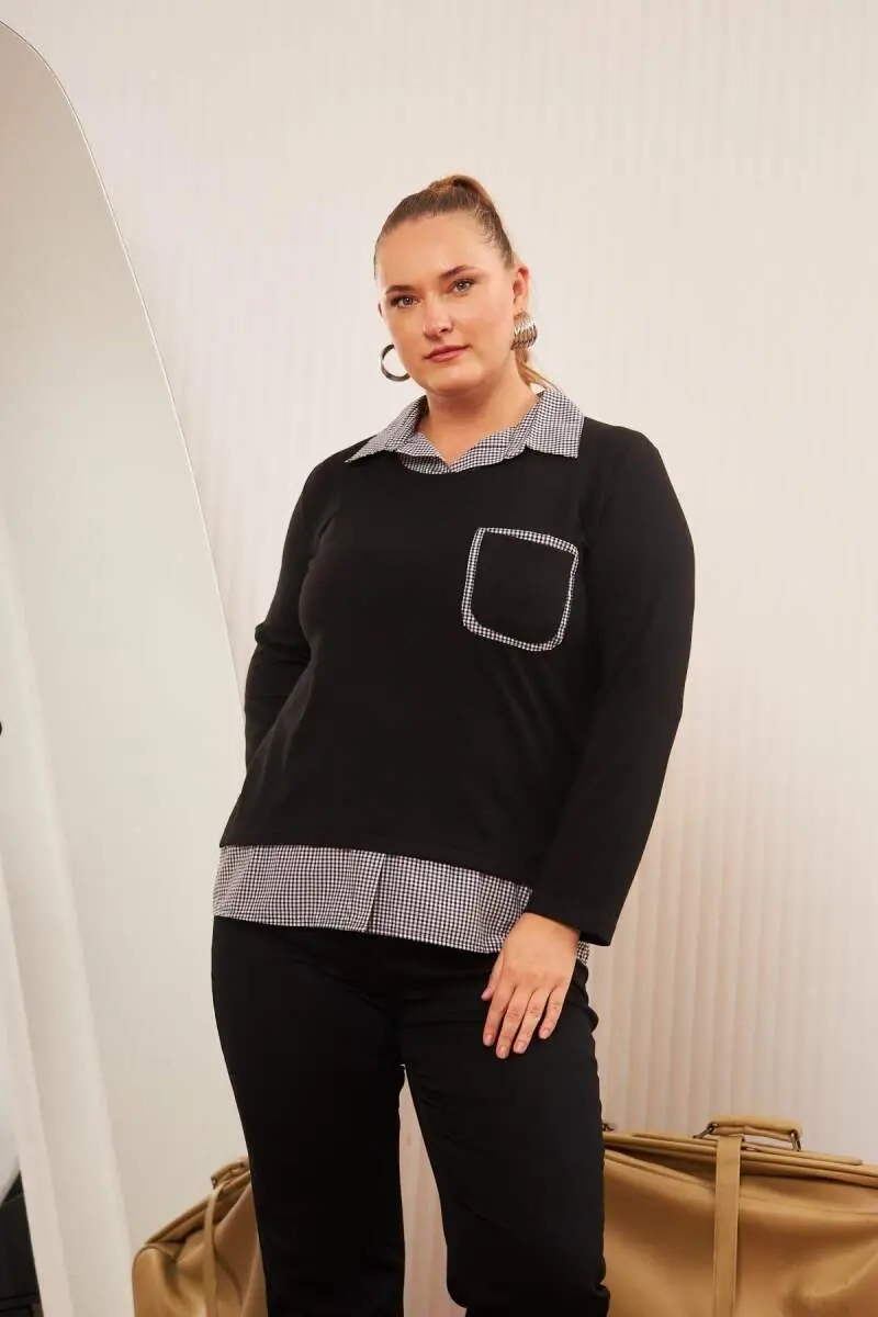 Cep Detaylı Ekoseli Büyük Beden Siyah Gömlek Bluz