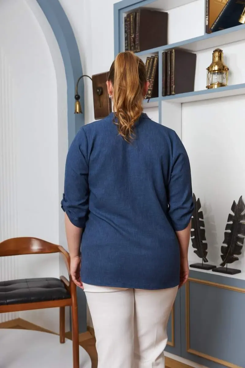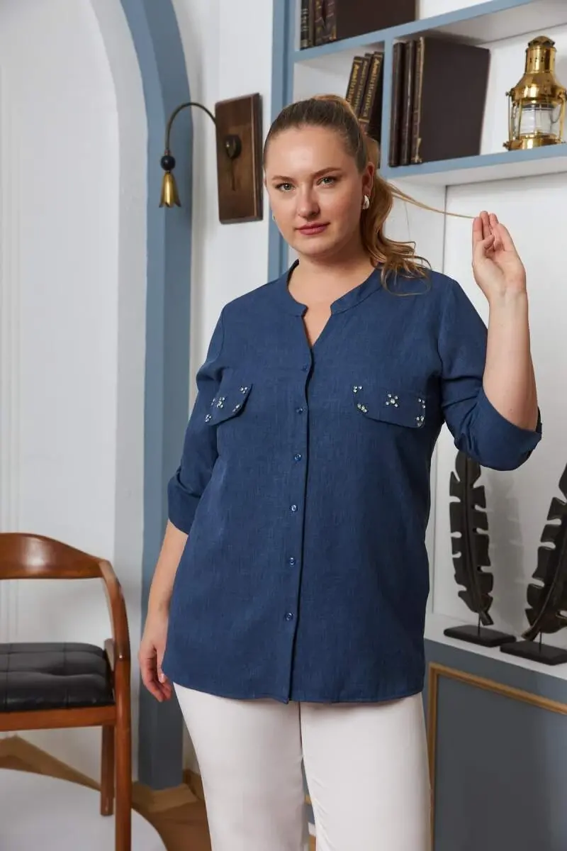 RMG'nin özel tasarımı olan İndigo renkli Cep Kapak Taş Detaylı Büyük Beden Gömlek, şıklığınızı tamamlar.Kaliteli kumaşı ve şık tasarımıyla öne çıkan bu gömlek, büyük beden koleksiyonumuzun vazgeçilmezi. Ürün İçeriği: % 70 Viskon % 30 Polyester Kumaş Türü: Dokuma Model Bilgileri: Boy: 1,86 - Göğüs: 115 - Bel: 88 - Basen: 120 Numune Bedeni: 44 Ürün Boyu: 75 cm. Sezon: YAZLIK