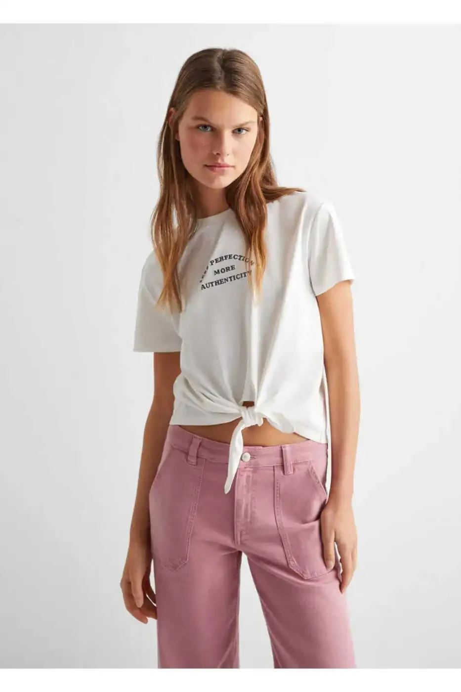 Jinsi uslubidagi kommunal matoga ega boʻlgan bu shimlar-yubka uzun boʻyli va odatiy bel boʻyiga ega. Ikkita choʻntagi boʻlib, fermuar va tugma bilan yopiladi. Qisqartirilgan dizaynga ega tekis model. 172 sm boʻyli model M oʻlchamli kiyim kiygan.