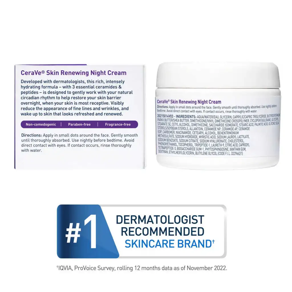 Developed with dermatologists, CeraVe Skin Renewing Night Cream is formulated with biomimetic peptides, hyaluronic acid, and three essential ceramides that work together to lock in skins moisture and help restore your skin's protective barrier overnight. This non-greasy, intensely moisturizing skin renewing night cream is designed to soften and renew the look of tired skin. Face cream helps reduce the look of fine lines and wrinkles while supporting skin elasticity. Cerave night cream for face features patented MVE Delivery Technology which continually releases moisturizing ingredients all night - so you can wake up looking rested and rejuvenated. How to Use: Apply this night cream in small dots where needed around the face and gently smooth until thoroughly absorbed. Use nightly before bedtime to help soften and renew the look of tired skin overnight.