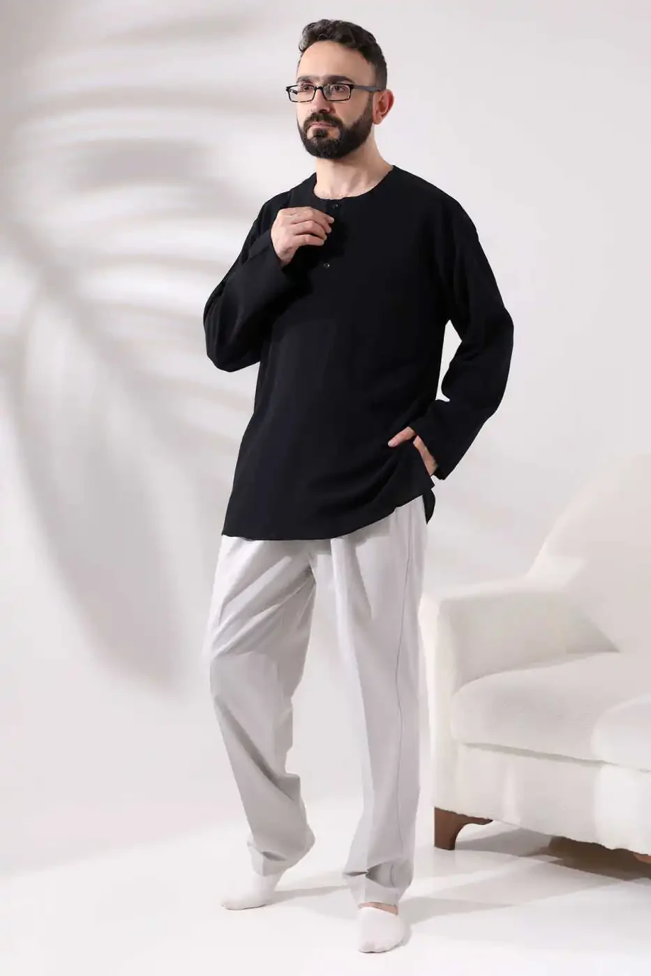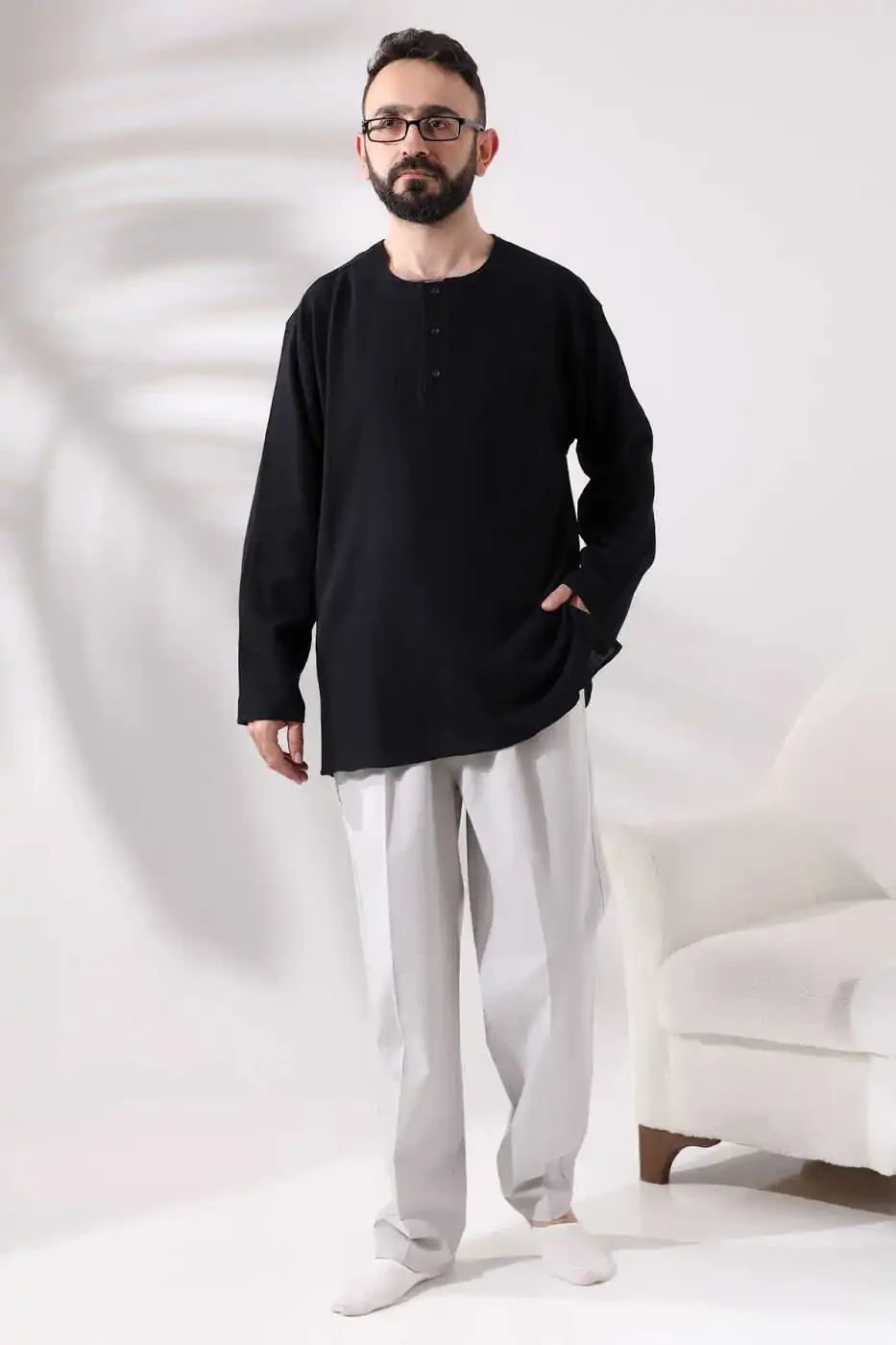 Черная мужская рубашка свободного кроя с 3 пуговицами и без воротника для хаджа и умры объединяет в себе комфорт и функциональность. Свободный крой и прямые рукава обеспечивают комфорт в течение всего дня, сохраняя прохладу и не давая потеть. Трехкнопочная модель сочетает в себе элегантность и простоту использования, а свободный крой не сковывает движения и позволяет чувствовать себя комфортно в любой момент.