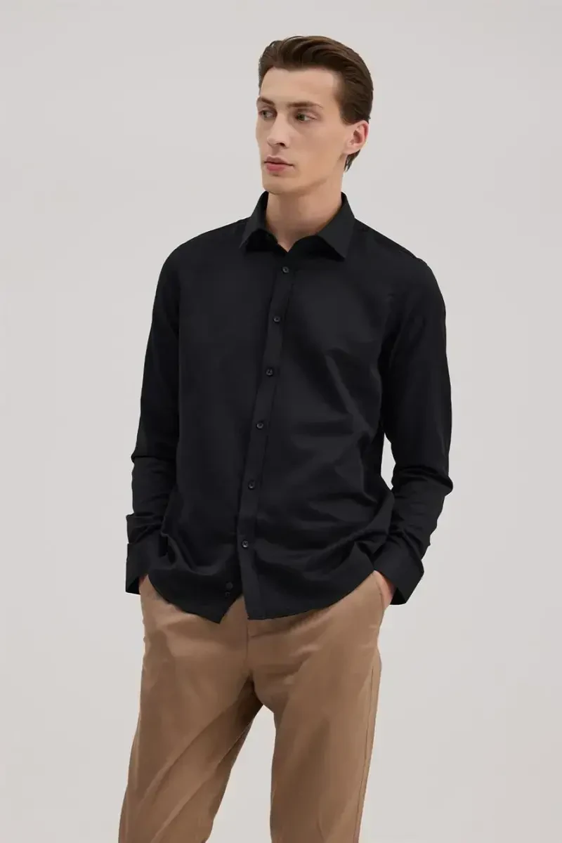 Черная рубашка, comfort fit, воротник на пуговицах, смесовый хлопок, мужская рубашка, стильная рубашка, современный дизайн, длинные рукава, удобная рубашка, повседневная одежда