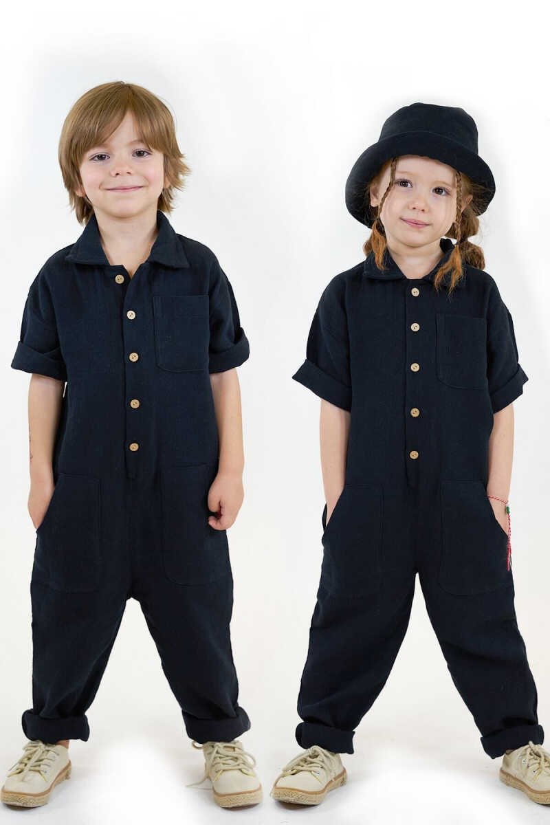 Характеристики черного комбинезона с двойным муслиновым воротником и 3 карманами: