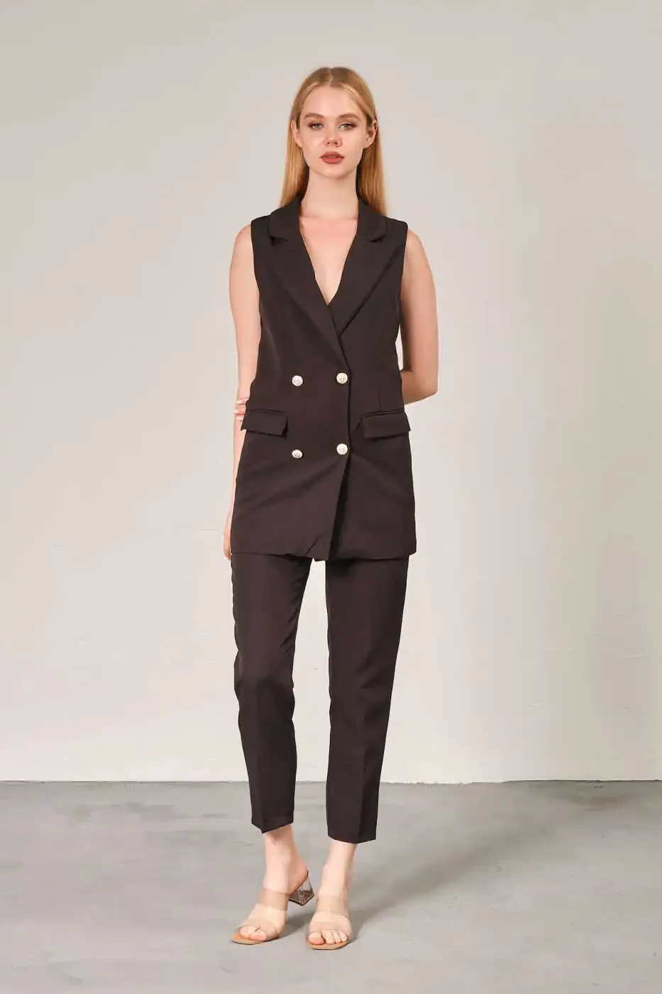 С черным костюмом-тройкой с жилетом, блейзером и узкими брюками из атласной ткани вы будете чувствовать себя уверенно и стильно. Этот костюм - идеальный выбор для того, чтобы произвести впечатление в особых случаях и в деловой жизни.