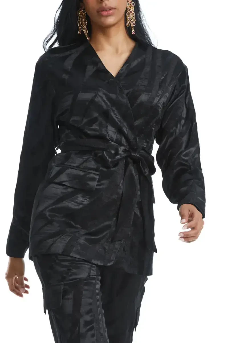 Асимметричный брючный костюм черного цвета с ярким узорчатым поясом