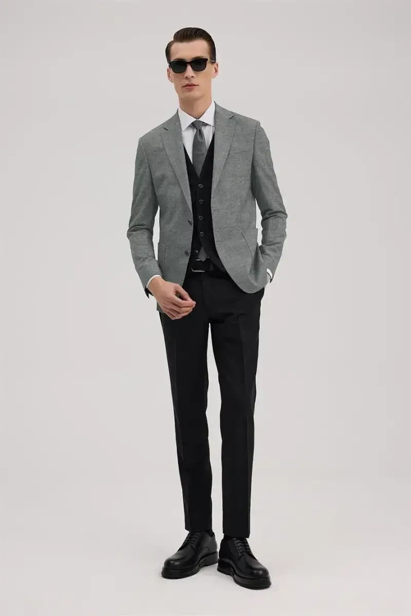 Черный приталенный костюм-тройка с моно-воротником сочетает в себе элегантность и изысканность, которые должны быть в гардеробе современного мужчины. Этот костюм особого дизайна предлагает безупречный внешний вид как в деловой жизни, так и на особых мероприятиях. Приталенный крой привлекает внимание своей облегающей фигурой, а моно-воротник добавляет классический штрих. Наличие жилета позволяет вам подчеркнуть свой стиль, добавляя образу дополнительную изюминку. Благодаря высококачественной ткани он обеспечивает комфорт в течение всего дня. Дышащая структура ткани предотвращает потоотделение и позволяет вашей коже оставаться комфортной. Благородный черный цвет позволяет легко сочетать его с рубашками и галстуками любого типа. Вы можете отразить свой собственный стиль, сочетая его как с классической белой рубашкой и черным галстуком, так и с более смелыми цветами и узорами. Жилет - идеальный вариант для тех, кто хочет сохранить серьезность костюма, но в то же время добавить ему изюминку. Детали швов пиджака и брюк подчеркивают качество и тщательность изготовления костюма. Брюки легко гладятся и сохраняют свой элегантный вид в течение длительного времени. Подкладка костюма изготовлена из специальной ткани, которая впитывает пот и не вредит вашей коже. Детали пуговиц также подобраны в соответствии с общим дизайном костюма. Почувствуйте себя особенным и выделитесь в любой обстановке с черным приталенным костюмом-тройкой с моно-воротником. Этот костюм - не просто одежда, это еще и инвестиция. Благодаря качественной ткани, кропотливой работе и стильному дизайну он на долгие годы займет свое место в вашем гардеробе. Выберите черный приталенный костюм-тройку с моно-воротником, чтобы отразить свой стиль и подчеркнуть свою элегантность.