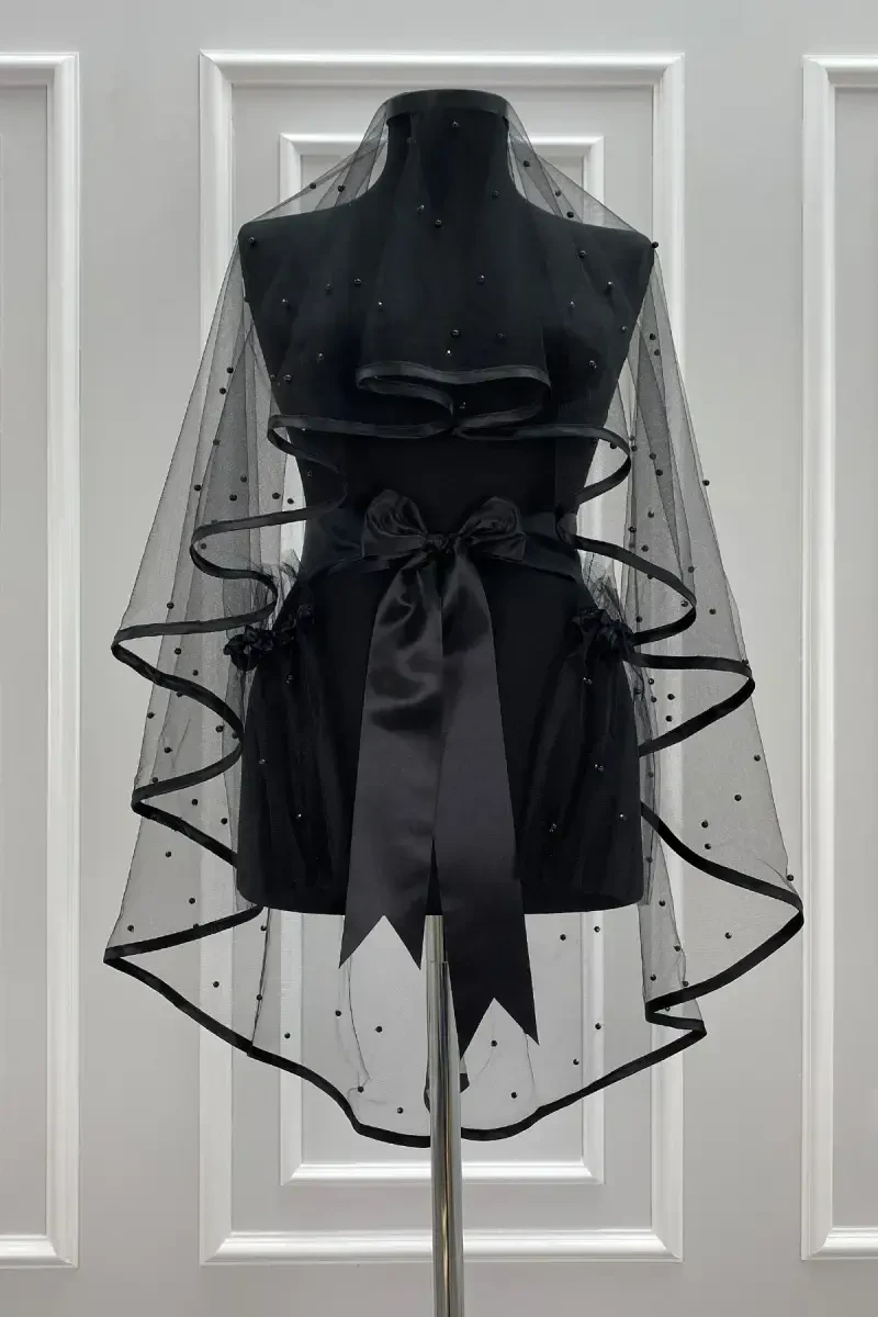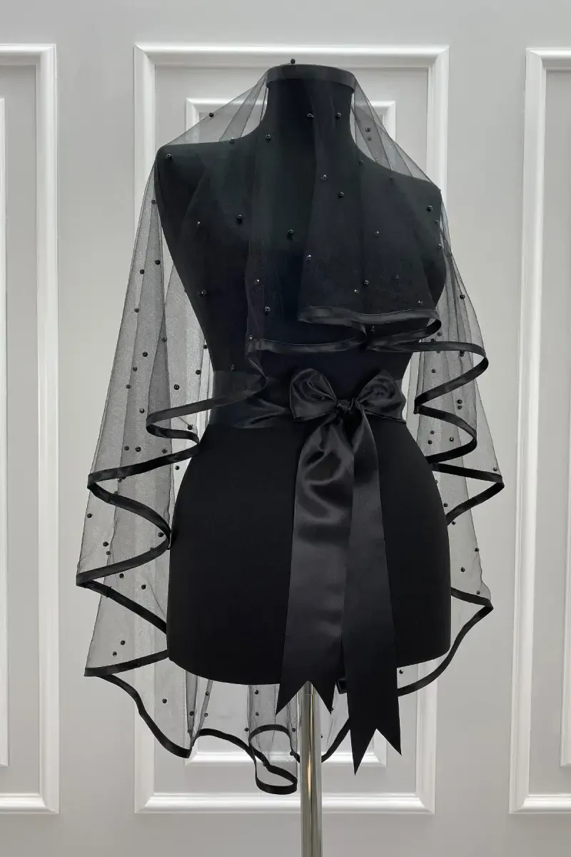 Черный Свадебный Фата Комплект, С Окантовкой и Крупным Жемчугом, Девичник, Свадьба, Фата для Никаха, Покрывало - С Окантовкой и Жемчугом ЧЕРНЫЙ
