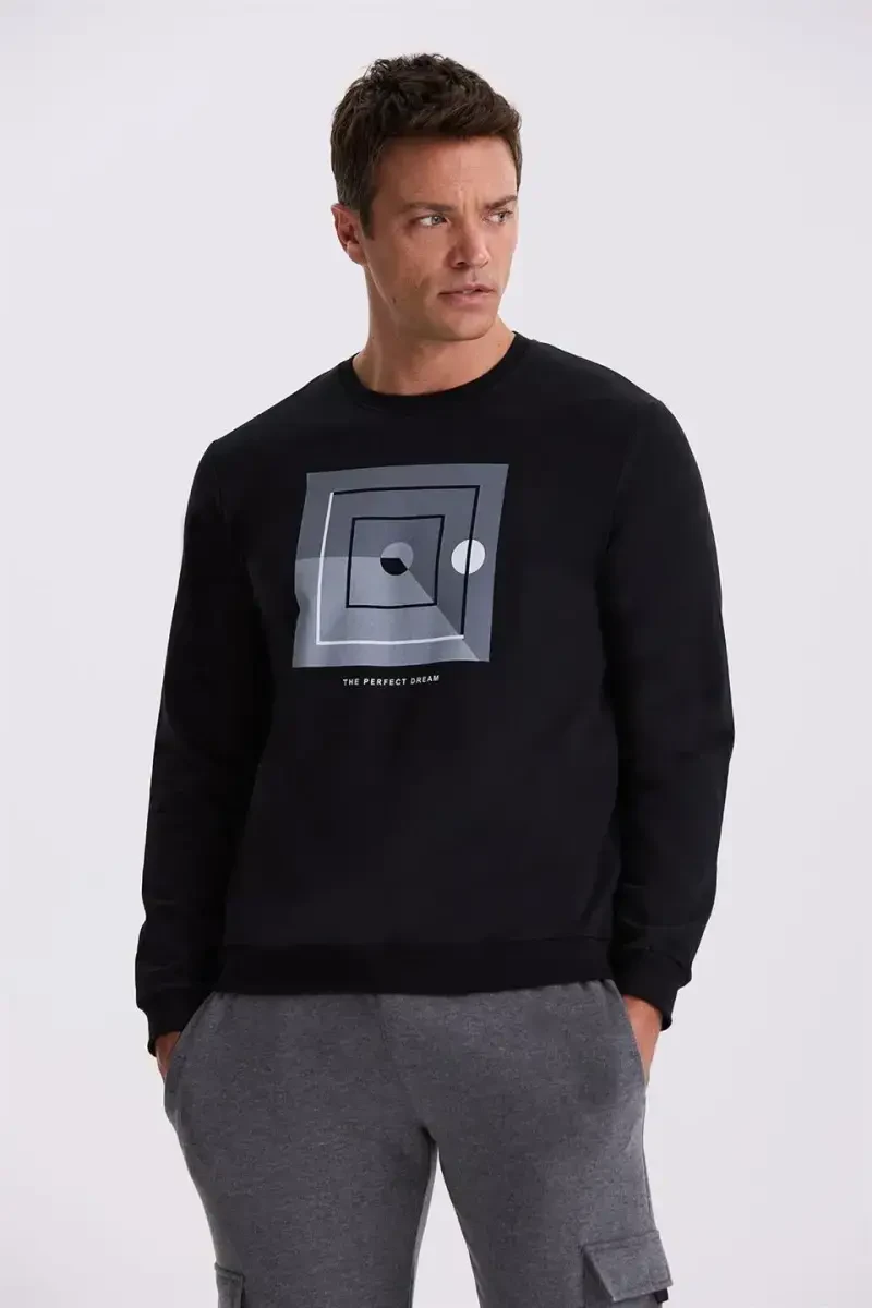 Черный свитшот с круглым вырезом, принтом и зауженным силуэтом: идеальное сочетание стиля и комфорта