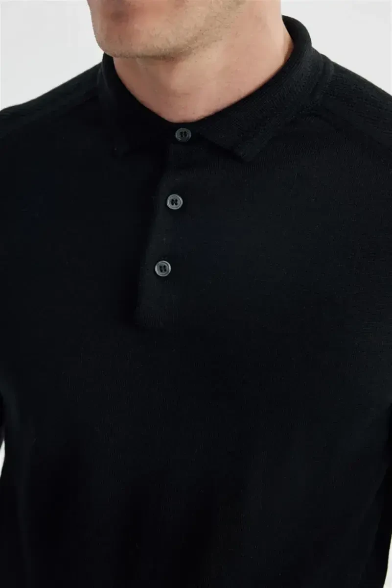Черный свитер Slim Fit из шерсти с узором и воротником поло | Стильный и теплый