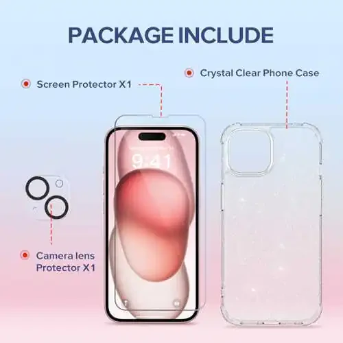 Чехол TIESZEN 5 в 1, совместимый с iPhone 15, с блестками, 2 защитными стеклами для экрана + 2 защитными стеклами для объектива камеры, [не желтеет], прозрачный блестящий тонкий противоударный чехол для телефона для женщин 6,1 дюйма