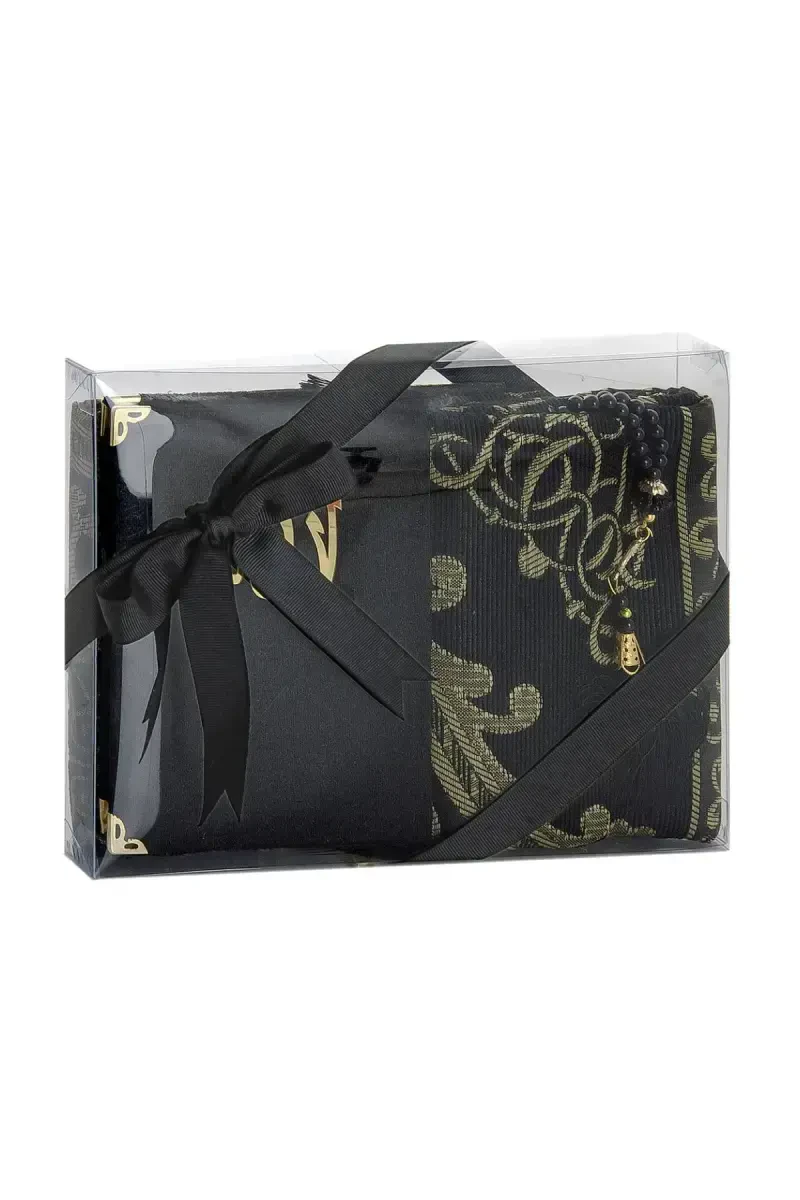 Черный тафтовый коврик для намаза, входящий в набор, размером 110 x 70 см обеспечивает просторное и удобное использование. Его мягкая текстура и нескользящая основа обеспечивают максимальный комфорт во время молитвы.