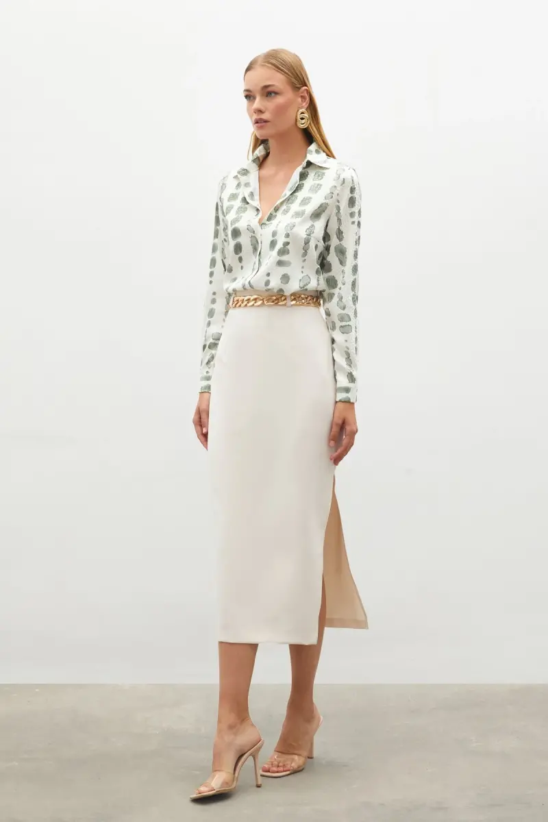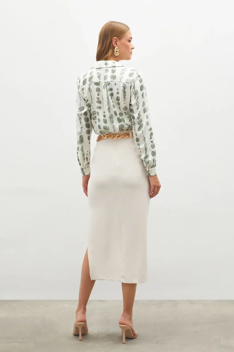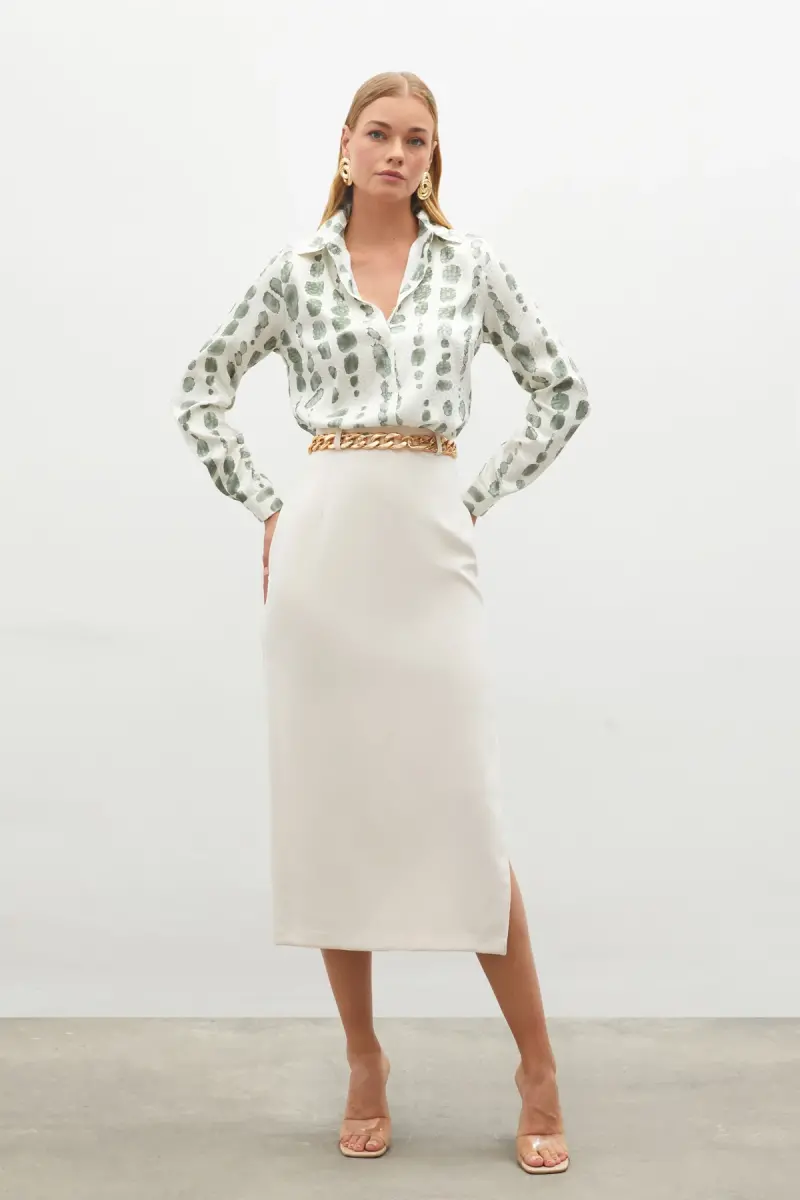 63% Cotton 34% Polyester 3% Lycra, Plain, Pencil, Midi, Plain, No Pattern, Chain Detailed, Zippered, Lined, Regular WaistProduct DescriptionExperience elegance and comfort with the Chain Belted Pencil Skirt. This skirt, carrying the nobility of beige, will be an indispensable part of your wardrobe with its modern design and elegant details. The pencil skirt cut perfectly reveals your body lines, while the midi length offers a suitable option for both daily use and special occasions. The skirt is made of a blend of 63% cotton, 34% polyester, and 3% lycra. The natural texture of cotton allows your skin to breathe, while the durability of polyester fabric and the flexibility of lycra provide comfortable use throughout the day. This special blend of fabric helps the skirt maintain its shape for a long time and offers a wrinkle-resistant structure. Its plain pattern and beige color make it easy to combine the skirt. You can create different styles by completing it with either a stylish blouse or a sporty t-shirt. The chain-detailed belt adds a modern and stylish touch to the skirt, while emphasizing your waist to help you create a more elegant silhouette. Thanks to its zippered structure, it can be easily worn and removed. The lining inside the skirt increases wearing comfort and provides a more comfortable use by preventing the fabric from directly contacting your skin. The normal waist cut adapts to every body type and ensures you are comfortable throughout the day. The Chain Belted Pencil Skirt is an excellent option that will highlight your elegance in business life, special occasions, or daily use. Combining both classic and modern style, this skirt is a candidate to be one of the most loved pieces of your wardrobe. You will always continue to be trendy with the timelessness of beige and the elegance of the pencil skirt cut. Complete your style with this skirt and make a difference in every environment.Product Features* 63% Cotton, 34% Polyester, 3% Lycra* Straight Cut* Pencil Skirt Model* Midi Length* Patternless* Chain Detailed Belt* Zipper Closure* Lined* Normal WaistAdditional InformationFollow the washing instructions on the label for the long life of the product. The product on the mannequin is size S. Different size options are available.