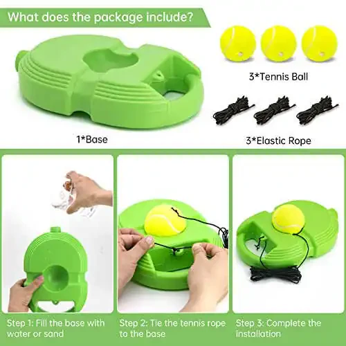 Single Trainer:This is a great one-person tennis trainer with 3 tennis balls with rope. Tips: Tennis balls are consumables. It is recommended to replace them with new ones after a period of us High Quality and Durable:Tennis trainer is made of high-quality PE material, the tennis ball is made of thickened rubber inner liner and elastic nylon rope, which can achieve effective rebound and durable Clever Design:The top is a semi-circular groove design, tennis balls can be placed when not in use. The middle part is designed as an annular groove, which can place the elastic thread, thereby avoiding the trouble of entanglement and knotting, and is more conducive to storage Designed for Single Training:The tennis self trainer is equipped with high-quality elastic ball with 13 ft elastic string. When you hit the ball, the tennis ball will rebound again by the traction line to achieve the effect of repeated strikes.Do not hit the ball again before it bounces back to the ground Easy to Carry:The tennis training device is designed as a hollow structure kettle. After training, you can open the mouth of the bottle and pour out the water or sand inside. At the same time, a handle is added to the side to make carrying more convenient and comfortable