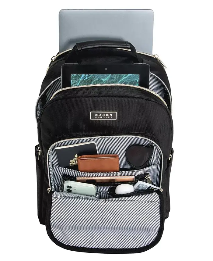 Chelsea Women's Chevron Quilted 15-Inch Laptop & Tablet Fashion Travel Backpack - Black is a candidate to be the indispensable companion of the modern woman in city life! This stylish and sophisticated backpack from Kenneth Cole Reaction combines both functionality and aesthetics, accompanying you every moment of your professional life. Considering our dependence on technology in today's fast-paced life, this backpack is specially designed to safely carry your laptop and tablet.The chevron pattern adds an elegant and modern touch to the bag, while the black color easily complements any outfit, completing your style. Made of high-quality materials, this backpack guarantees to serve you for many years with its durability. Whether you are going to work, traveling, or getting lost in your daily hustle, the Chelsea backpack is designed to meet all your needs.Inside the bag, there is a specially designed compartment for laptops up to 15 inches. This compartment protects your device from bumps and scratches, allowing you to carry it safely. There is also a separate padded compartment for your tablet, so you can safely carry both devices with you at the same time. The large main compartment offers enough space for your books, notebooks, chargers, and other personal belongings. Two open pockets inside help you keep your small accessories organized.The exterior design of the Chelsea backpack is as useful as its interior design. The open pockets on both sides of the bag allow you to keep your water bottle or other drinks in an easily accessible place. Thanks to the luggage strap on the back, you can easily carry your backpack by securing it to your suitcase while traveling. Adjustable and padded shoulder straps offer comfortable use all day long, while the carrying handle on the top provides you with a practical alternative when you want to carry the bag in your hand.Kenneth Cole Reaction has used premium self-repairing gold zippers designed for long-lasting use in this backpack. The tear-resistant inner lining keeps your belongings safe, while the easy-to-clean outer surface ensures that the bag always looks new. The Chelsea Women's Chevron Quilted Backpack is backed by a limited lifetime warranty, so you can be sure that you will be satisfied with your purchase. Combining elegance, functionality and durability, this backpack is the perfect choice to meet the needs of the modern woman.