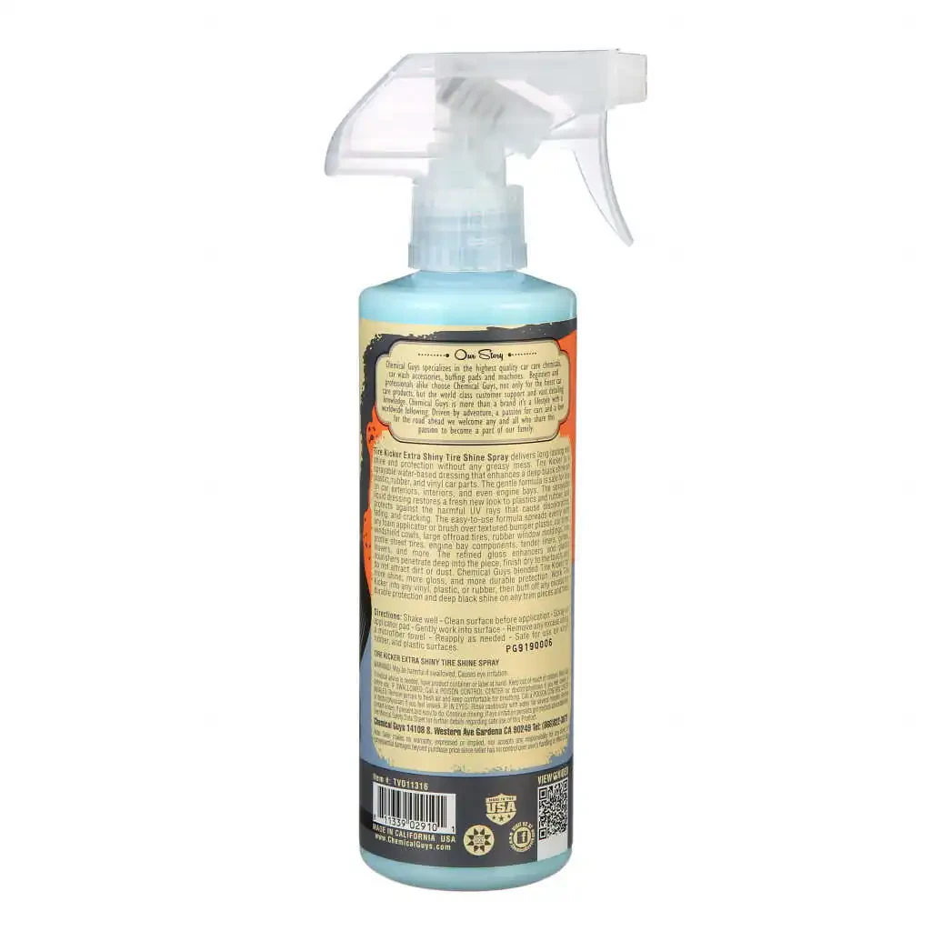 Chemical Guys Tire Kicker обеспечивает длительный влажный блеск и защиту без каких-либо жирных следов, чтобы восстановить детали и придать им такой же вид, как в автосалоне! Мягкая формула безопасна для использования на внешних и внутренних частях автомобиля и даже в моторных отсеках. Жидкий состав восстанавливает свежий новый вид пластика и резины, а также защищает от вредных УФ-лучей, которые вызывают обесцвечивание, выцветание и растрескивание.
