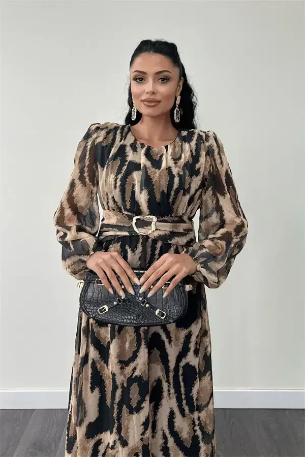 Shine at your special occasions and invitations with the Chiffon Fabric Belt Detailed Maxi Dress, which offers elegance and grace together. This maxi dress, which carries the warmth of earth tones with its brown color, offers comfort all day long with the lightness of chiffon fabric. Its long and flowing cut elegantly reveals your body lines, while the belt detail emphasizes your waist and allows you to achieve a fitter look. The lining inside the dress prevents transparency and provides a safe use. Shoulder pads help you create a stronger and more modern stance by adding structure to your silhouette. The absence of a zipper allows the dress to be easily put on and taken off. Thanks to its slightly flexible structure, it does not restrict your freedom of movement and allows you to feel comfortable throughout the day. Whether you attend a stylish invitation with heels or show off at a more comfortable event with sandals, this maxi dress will accompany you in any environment. The brown tone can be easily combined with different accessories, so you can reflect your own style. The flowing structure of chiffon fabric adds elegance to you at every step, while the belt detail completes your elegance. This dress will be an indispensable part of your wardrobe. It has a timeless design that you can easily wear in any season. If you want to feel special and make a difference with your elegance, the Chiffon Fabric Belt Detailed Maxi Dress is for you! You will dazzle in every moment with this dress, which offers both comfort and elegance together. Remember, being stylish is hidden in the details, and this dress offers you a perfect look with its details.