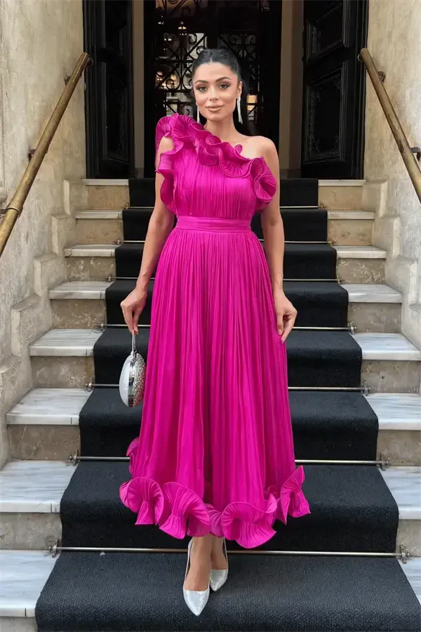 Showcase your elegance and style on your special occasions with the Chiffon Fabric One-Shoulder Evening Dress - FUCHSIA. This evening dress, designed with the vibrancy of fuchsia color and the lightness of chiffon fabric, offers a modern and eye-catching look with its one-shoulder detail. With a length of 120 cm from the shoulder, this dress has an ideal length, allowing you to create both a comfortable and glamorous style. The back zipper allows it to be easily put on and taken off, while the inner lining and bustier detail increase your comfort. The dynamic structure of the chiffon fabric emphasizes your elegance with every step. The one-shoulder design adds a different touch to the shoulder and arm area, while the energy of the fuchsia color combines to create an unforgettable look. This special design evening dress is ready to accompany you on all your special occasions such as engagements, weddings, graduation ceremonies and special invitations. Attract all the attention with this stylish evening dress, which will be an indispensable part of your wardrobe. Thanks to the lightness and comfort of the chiffon fabric, you can have fun comfortably throughout the night. The one-shoulder detail offers a modern and asymmetrical look, making you different. The vibrancy of the fuchsia color reflects your energy and adds a positive atmosphere to the environment. With this evening dress, you will not only look stylish but also feel confident and good about yourself. Choose the Chiffon Fabric One-Shoulder Evening Dress - FUCHSIA to leave an unforgettable mark on your special occasions. The chiffon fabric of the dress elegantly reveals the lines of your body, while the one-shoulder detail creates a modern silhouette. The vibrancy of the fuchsia color ensures that you are noticed in any environment. This evening dress is not just a garment, but also a style statement. It is designed to highlight your elegance and grace. It is a piece that will remain in your wardrobe for many years with its special design details and quality workmanship. If you want all eyes to be on you at your engagement, wedding or graduation ceremony, this evening dress is for you. This design, which combines the energy of the fuchsia color and the elegance of the chiffon fabric, will make you feel special. The one-shoulder detail allows you to move away from the ordinary and achieve a modern look. With this evening dress, you will not only look stylish but also feel confident and good about yourself. Don't miss this special design that will accompany you in your unforgettable memories.