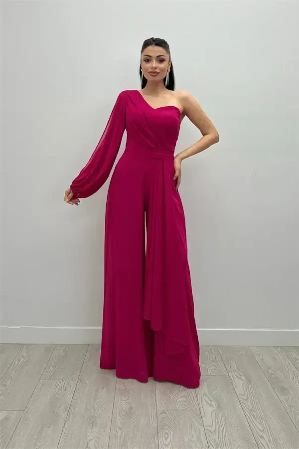 Capture the perfect harmony of elegance and style with the Chiffon Fabric One Shoulder Detail Jumpsuit - FUCHSIA. Designed to dazzle at your special occasions, parties, or a chic dinner, this jumpsuit offers a modern and sophisticated look. This design, combining the vibrancy of fuchsia color and the lightness of chiffon fabric, provides you with both comfort and confidence. The one-shoulder detail emphasizes the jumpsuit's uniqueness, while its asymmetrical cut creates a striking style. The fabric that gracefully flows down from the shoulder accompanies your movements, making you shine like a star. The lining inside the jumpsuit guarantees your comfort throughout the day, while the bustier detail provides extra support. The back zipper makes it easy to put on and take off, while helping the jumpsuit fit your body lines perfectly. The fabric's lack of stretch ensures that the jumpsuit retains its shape and always looks chic. The elasticated sleeve detail does not restrict your freedom of movement and adds a modern touch to the jumpsuit's design. The Chiffon Fabric One Shoulder Detail Jumpsuit - FUCHSIA is not just a piece of clothing, but also a statement. Make your style speak in every environment with this jumpsuit, which will be an indispensable part of your wardrobe. Whether you create a stylish combination with high heels or a more relaxed look with sandals, this jumpsuit will accompany you in every situation. Choose the Chiffon Fabric One Shoulder Detail Jumpsuit - FUCHSIA to feel special and leave an unforgettable impression.