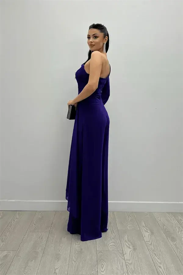 Chiffon Fabric One Shoulder Detailed Jumpsuit - PURPLE is a design that combines elegance and modernity, allowing you to dazzle at many different events, from special invitations to cocktails, stylish dinners to weddings. The one-shoulder detail adds an asymmetrical touch to the jumpsuit's silhouette, while the light and fluid texture of the chiffon fabric highlights your elegance with every move. The enchanting tone of purple supports the jumpsuit's sophisticated look and instills confidence in the wearer. This jumpsuit offers both comfort and style together, helping you leave an unforgettable mark on your special moments. The back zipper allows it to be easily put on and taken off, while the bustier detail inside provides extra comfort and support. Thanks to its lining, it does not show through and allows you to feel comfortable all day long. The elastic detail on the sleeve creates a stylish look and allows your arm to move comfortably. The non-stretch fabric ensures that the jumpsuit retains its shape and is long-lasting. With the Chiffon Fabric One Shoulder Detailed Jumpsuit - PURPLE, you will be talked about for your style in every environment you enter. This special design jumpsuit will be an indispensable part of your wardrobe and will always make you feel stylish and confident. Whether you combine it with high heels for a more formal look or create a more casual style with sandals, this jumpsuit is a perfect option in any case. It also easily adapts to your accessories, allowing you to reflect your personal style. Chiffon Fabric One Shoulder Detailed Jumpsuit - PURPLE is not just a piece of clothing, but also a form of expression. It highlights your beauty and elegance, while allowing you to display a modern and stylish stance.