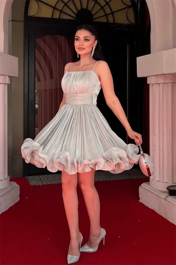 Experience elegance and style with the Chiffon Fabric Ruched Detail Strappy Mini Dress. Carry the energy of summer with the refreshing effect of the mint green color. This special design dress attracts attention with the lightness of the chiffon fabric and the modern touch of the ruched details. The mini length of 90 cm from the shoulder allows you to highlight your style without restricting your freedom of movement. Thanks to its back zipper, it can be easily put on and taken off. The lining inside offers comfortable use all day long, while the bustier detail provides extra support and confidence. The carefully sewn stones on the waist add an elegant sparkle to the dress and complete your elegance. Thanks to its full fit, it fits your body perfectly and creates a perfect silhouette. Its non-stretch fabric retains its shape for a long time and ensures you always look stylish. Whether it's a special occasion or a summer evening stroll, all eyes will be on you with the Chiffon Fabric Ruched Detail Strappy Mini Dress. The vibrancy of the mint green color and the modern details of the dress will bring a fresh breath to your style. Make a difference in every environment with this dress that will be an indispensable part of your wardrobe. It is an ideal choice to feel special and beautiful. By choosing this dress, you can enjoy being stylish without sacrificing your comfort, and you can brighten your day with the positive energy of the mint green color. With the lightness of the chiffon fabric, the elegance of the ruched details and the sparkle of the stones on the waist, this dress is designed for you to have unforgettable moments. Reflect your style and increase your self-confidence with this special design dress, every detail of which has been carefully considered. This dress, which is a candidate to be the most popular piece of your summer wardrobe, will take you one step ahead in every environment. Experience the perfect harmony of elegance and comfort with the Chiffon Fabric Ruched Detail Strappy Mini Dress.