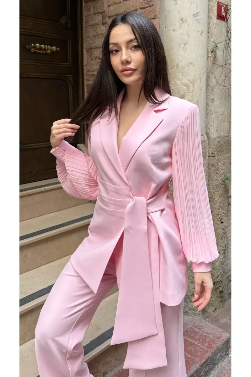 Our Chiffon Sleeve Two-Piece Set is a special design that combines elegance and comfort. This set attracts attention with its chiffon-detailed sleeves and offers all-day comfort with its quality fabric. The top piece of the two-piece set has an elegant cut and gives a lively look with its chiffon sleeves. The bottom piece consists of comfortable-cut trousers or a skirt and provides a perfect match with the top piece. The pink color of the set adds a feminine and vibrant touch, and it can be easily combined with different combinations. This set, which you can prefer for daily use as well as for special invitations or stylish events, will be one of the indispensable parts of your wardrobe.Product DescriptionChiffon Sleeve Two-Piece Set - Pink is a carefully designed combination that offers a modern and elegant look. This set is a versatile option that can be worn both in daily life and on special occasions. The most striking feature of the set is its chiffon-detailed sleeves. These sleeves add a light and romantic feel to the set while offering a stylish touch. The vibrancy of the pink color allows you to stand out in any environment and reflects your feminine energy. The top piece has a comfortable cut and does not restrict your freedom of movement. Chiffon sleeves add an elegant detail to the design of the top piece and make the set more special. The bottom piece can be trousers or a skirt, depending on your preference. Both options are in perfect harmony with the top piece and create a stylish silhouette. The trousers offer all-day comfort thanks to their comfortable cut, while the skirt provides a feminine look. The fabric quality ensures that the set is long-lasting and always looks stylish. Whether you are attending a special invitation with heels or creating a daily elegance with sandals, the Chiffon Sleeve Two-Piece Set - Pink will accompany you in any situation. This set is a candidate to be one of the most loved pieces in your wardrobe. With the lightness of chiffon and the energy of pink, you will feel special in every moment. You can easily prefer this set in the office, at friend gatherings or special dinners, and it offers both elegance and comfort. It is an ideal option to reflect your own style and create different combinations. Take your style one step further with the Chiffon Sleeve Two-Piece Set - Pink and dazzle in every environment.Product Features* Chiffon detailed sleeves* Comfortable cut* High quality fabric* Vibrant pink color* Versatile use (daily and special occasions)* Top and bottom piece harmony* Pants or skirt option* Design that provides freedom of movement* Elegant and stylish appearance* Long lasting and durableAdditional InformationThe model is wearing size S/36. The fabric content of our product is 95% polyester, 5% elastane. It is recommended to clean it according to the washing instructions. There may be tone differences due to screen differences in colors. Our product is produced in Turkey.