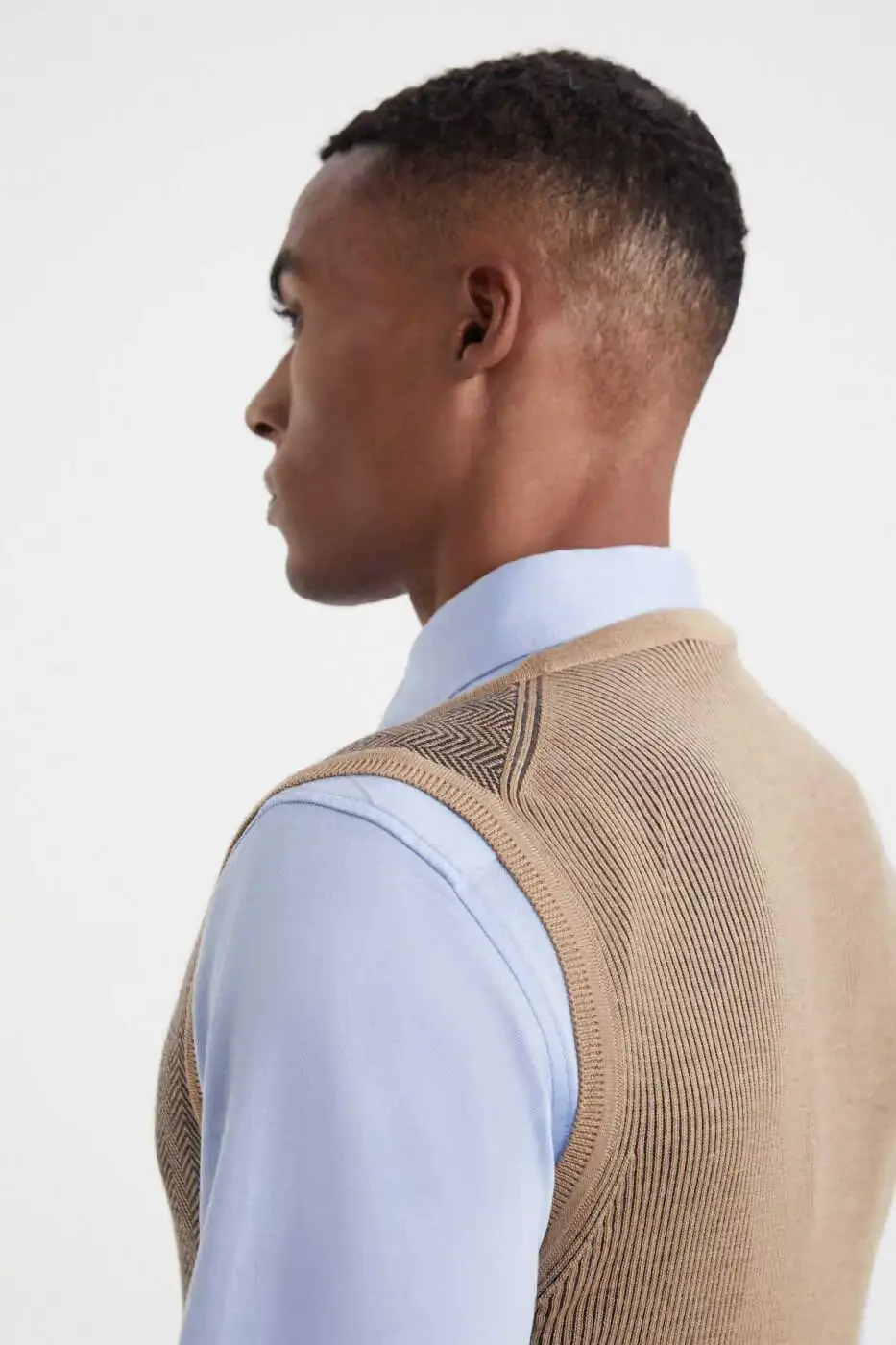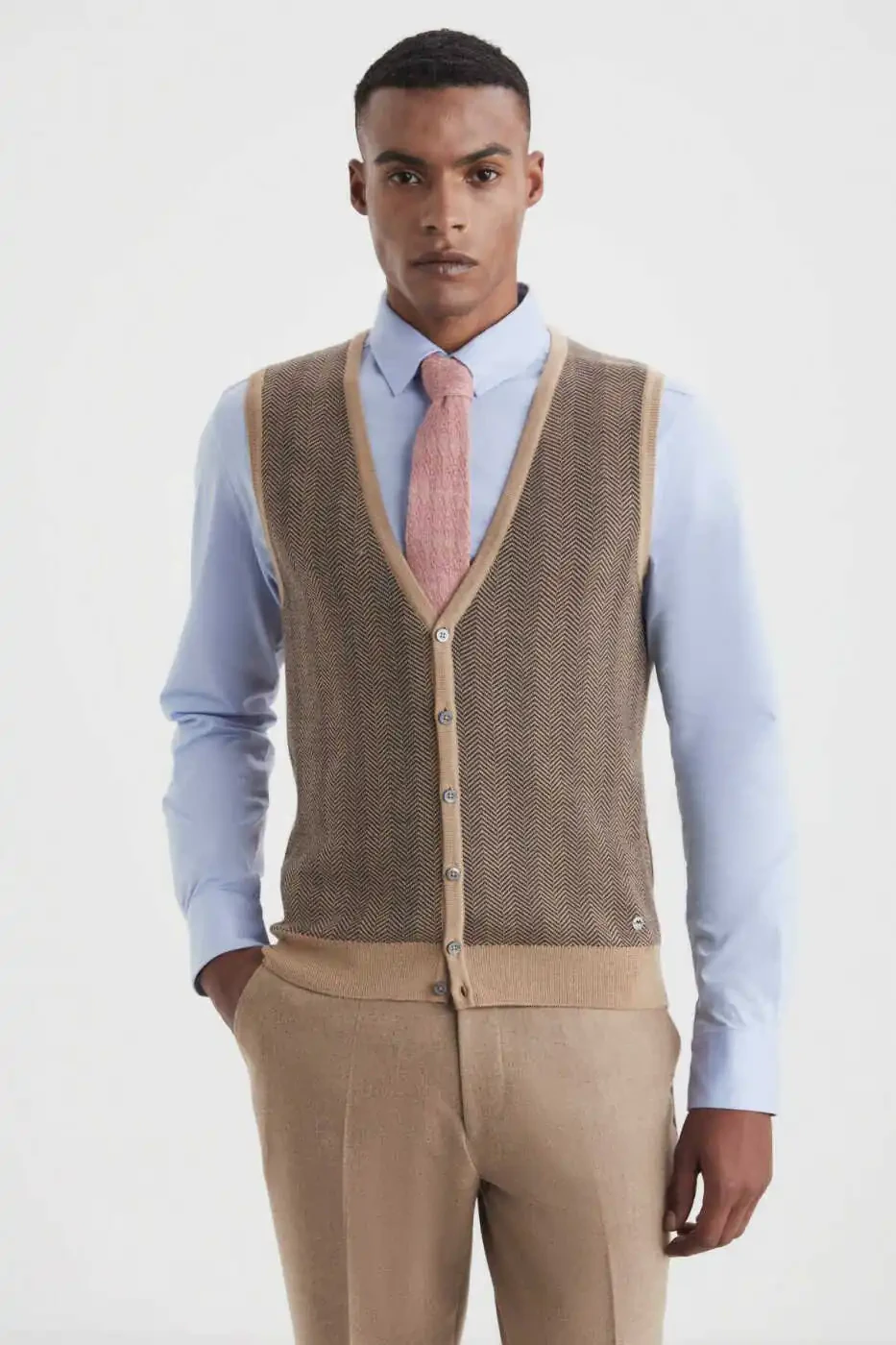 Chiziqli Camel Merino Yün Triko Jilet bilan oqlanganlik va qulaylikni birlashtiring!