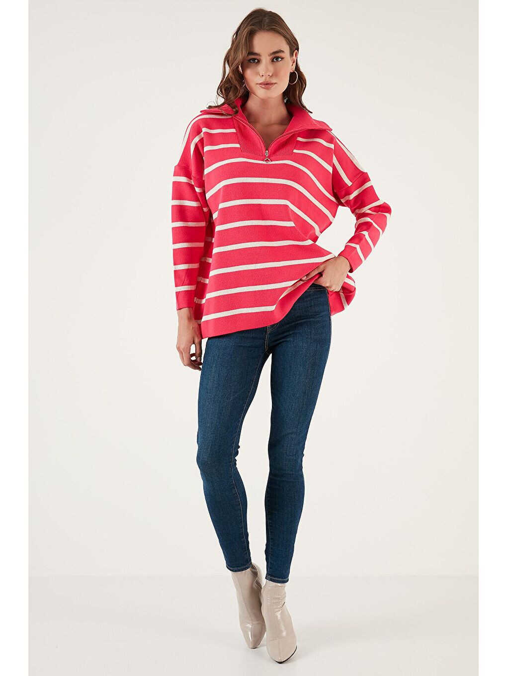 Chiziqli Yarim Fermuarlı Oversize Triko Ko'ylagini skinny jinsi shimlar bilan, legginslar bilan, yubkalar bilan yoki shortiklar bilan birlashtirib, nafis va qulay ko'rinishga ega bo'lishingiz mumkin. Sport poyabzallari, botinkalar yoki to'piqqa chiqishli poyabzallar bilan to'ldirishingiz mumkin.