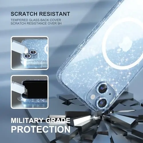 Package Includes: 1 x Magnetic Glitter Case replacement for iPhone 15, 2 x tempered glass screen protectors, and 2 x Camera Lens Protectors. Only Compatible with iPhone 15 6.1-inch 2023. Please check your phone model and make sure you order the right size Strong Magnetic Power: This compatible magsafe iPhone 15 case provides powerful built-in magnets with 1500g of holding force enabling faster, easier place-and-go wireless charging and a secure lock on any MagSafe accessory Slim and Lightweight: Made of hard quality PC back and soft tpu frame which is durable. Slim Fit tightly to the phone body, doesn't make your phone too bulky. Feels soft and easy to hold, offering enough grip for women and girls Full Glitter Design: Both the back and the side frame are full of glitter and come with a set shiny diamond camera lens protective cover, making your phone more feminine and bringing more compliments Screen and Camera Protection: Raised edge lip provide extra protection for your iPhone screen and camera from scratches and dirt when your iPhone is dropped accidentally. The glitter camera protectors not only protect the lens but also personalized decorations