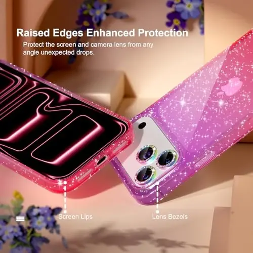 Choiche Compatible for iPhone 17 Pro Max Case offers a perfect combination of protection and style for your phone. This special set protects your phone from scratches, bumps, and daily wear and tear, while giving it an eye-catching look. The set includes a high-quality glitter case, two tempered glass screen protectors, and three diamond-look camera lens protectors, all perfectly compatible with your iPhone 17 Pro Max model. You will safely protect your phone's 6.9-inch screen and camera lenses, while attracting attention with its sparkling design. The perfect harmony of purple and pink colors of the case adds a feminine and fun atmosphere to your phone, while its sparkling surface dazzles in any environment. With its thin and light structure, it does not increase the weight of your phone and can be easily carried in your pocket or bag. Thanks to its ergonomic design, you can hold your phone comfortably in your hand and minimize the risk of slipping. Thanks to its high-quality PC back surface and soft TPU frame, this case offers long-lasting use. At the same time, thanks to its raised edge design, even if you accidentally drop your phone, the screen and camera lenses do not directly touch the surface, thus significantly reducing the risk of scratches and breakage. Choiche Compatible for iPhone 17 Pro Max Case is not just a phone case, but also an accessory that reflects your phone's style. The tempered glass screen protectors in the set protect your screen from scratches, fingerprints and other damage, while not affecting touch sensitivity. Diamond-look camera lens protectors both protect the lenses and add a stylish touch to your phone. This set is an ideal choice for women who prioritize the safety and style of their phones.