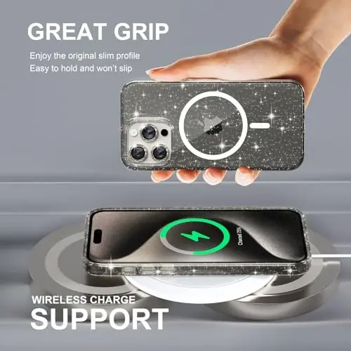 Package Includes: 1 x Glitter Magnetic Case Replacement for iPhone 15 Pro, 2 x tempered glass screen protectors, and 3 x Camera Lens Protectors.Only Compatible with iPhone 15 pro 6.1-inch 2023. Please check your phone model and make sure you order the right size. Strong Magnetic Power: This compatible magsafe iPhone 15 Pro case provides powerful built-in magnets with 1500g of holding force enabling faster, easier place-and-go wireless charging and a secure lock on any Mag-Safe accessory. Slim and Lightweight: Made of hard quality PC back and soft tpu frame which is durable. Slim Fit tightly to the phone body, doesn't make your phone too bulky. Feels soft and easy to hold, offering enough grip for women and girls. Full Glitter Design: Both the back and the side frame are full of glitter and come with a set shiny diamond camera lens protective cover, making your 15 pro more feminine and bringing more compliments. Screen and Camera Protection: Raised edge lip provide extra protection for your iPhone screen and camera from scratches and dirt when your iPhone is dropped accidentally. The glitter camera protectors not only protect the lens but also personalized decorations.