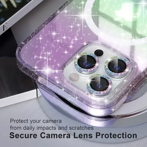 Package Includes: 1 x Glitter Magnetic Case Replacement for iPhone 15 Pro Max, 2 x tempered glass screen protectors, and 3 x Camera Lens Protectors.Only Compatible with iPhone 15 pro max 6.7-inch 2023. Please check your phone model and make sure you order the right size. Strong Magnetic Power: This compatible magsafe iPhone 15 Pro Max case provides powerful built-in magnets with 1500g of holding force enabling faster, easier place-and-go wireless charging and a secure lock on any Mag-Safe accessory. Slim and Lightweight: Made of hard quality PC back and soft tpu frame which is durable. Slim Fit tightly to the phone body, doesn't make your phone too bulky. Feels soft and easy to hold, offering enough grip for women and girls. Full Glitter Design: Both the back and the side frame are full of glitter and come with a set shiny diamond camera lens protective cover, making your 15 pro max more feminine and bringing more compliments. Screen and Camera Protection: Raised edge lip provide extra protection for your iPhone screen and camera from scratches and dirt when your iPhone is dropped accidentally. The glitter camera protectors not only protect the lens but also personalized decorations.