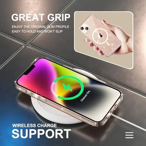 Package Includes: 1 x iPhone 14 Plus Glitter Magnetic Case, 2 x tempered glass screen protectors, and 2 x Camera Lens Protectors. Compatible for iPhone 14 Plus 6.7-inch 2022. Please check your phone model and make sure you order the right size Strong Magnetic Power: This compatible magsafe iPhone 14 Plus case provides powerful built-in magnets with 1500g of holding force enabling faster, easier place-and-go wireless charging and a secure lock on any MagSafe accessory Slim and Lightweight: Made of hard quality PC back and soft tpu frame which is durable. Slim Fit tightly to the phone body, doesn't make your iPhone 14 Plus too bulky. Feels soft and easy to hold, offering enough grip for women and girls Full Glitter Design: Both the back and the side frame are full of glitter and come with a set shiny diamond camera lens protective cover, making your iPhone 14 Plus more feminine and bringing more compliments Screen and Camera Protection: Raised edge lip provide extra protection for your iPhone screen and camera from scratches and dirt when your iPhone is dropped accidentally. The glitter camera protectors not only protect the lens but also personalized decorations