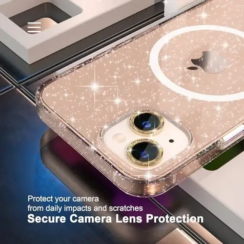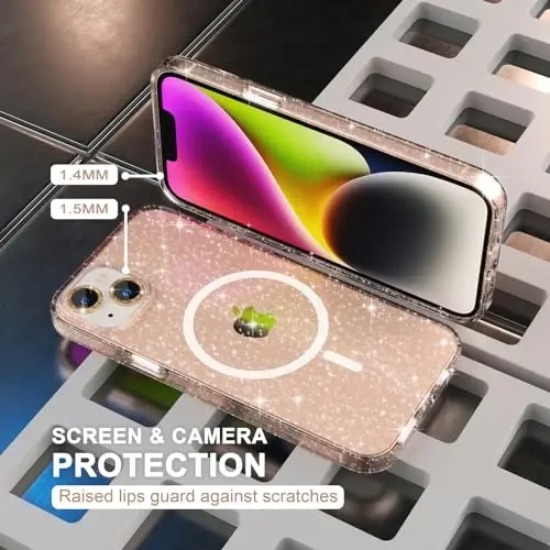 Package Includes: 1 x iPhone 14 Plus Glitter Magnetic Case, 2 x tempered glass screen protectors, and 2 x Camera Lens Protectors. Compatible for iPhone 14 Plus 6.7-inch 2022. Please check your phone model and make sure you order the right size Strong Magnetic Power: This compatible magsafe iPhone 14 Plus case provides powerful built-in magnets with 1500g of holding force enabling faster, easier place-and-go wireless charging and a secure lock on any MagSafe accessory Slim and Lightweight: Made of hard quality PC back and soft tpu frame which is durable. Slim Fit tightly to the phone body, doesn't make your iPhone 14 Plus too bulky. Feels soft and easy to hold, offering enough grip for women and girls Full Glitter Design: Both the back and the side frame are full of glitter and come with a set shiny diamond camera lens protective cover, making your iPhone 14 Plus more feminine and bringing more compliments Screen and Camera Protection: Raised edge lip provide extra protection for your iPhone screen and camera from scratches and dirt when your iPhone is dropped accidentally. The glitter camera protectors not only protect the lens but also personalized decorations