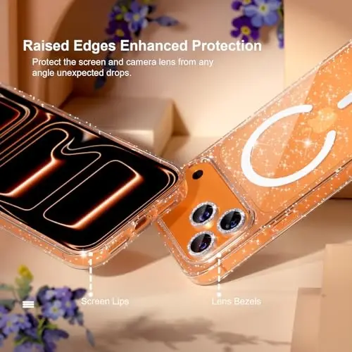 Package Includes: 1 x Glitter Magnetic Case Replacement for iPhone 17 Pro , 2 x tempered glass screen protectors, and 1 set of Camera Lens Protectors.Only Compatible with iPhone 17 pro 6.3-inch 2025. Please check your phone model and make sure you order the right size Strong Magnetic Power: This compatible Mag-Safe iPhone 17 pro case provides powerful built-in magnets with 1500g of holding force enabling faster, easier place-and-go wireless charging and a secure lock on any Mag-Safe accessory Militarty Grade Drop Protection: Made of quality hard PC back and soft tpu frame which is durable. Slim Fit tightly to the phone body, doesn't make your iphone 17 pro phone case too bulky. Feels soft and easy to hold, offering enough grip for women and girls Full Glitter Design: Both the back and the side frame are full of glitter and come with a set shiny diamond camera lens protective cover, making your 17 pro more feminine and bringing more compliments Screen and Camera Protection: Raised edge lip provide extra protection for your iPhone screen and camera from scratches and dirt when your iPhone is dropped accidentally. The glitter camera protectors not only protect the lens but also personalized decorations.